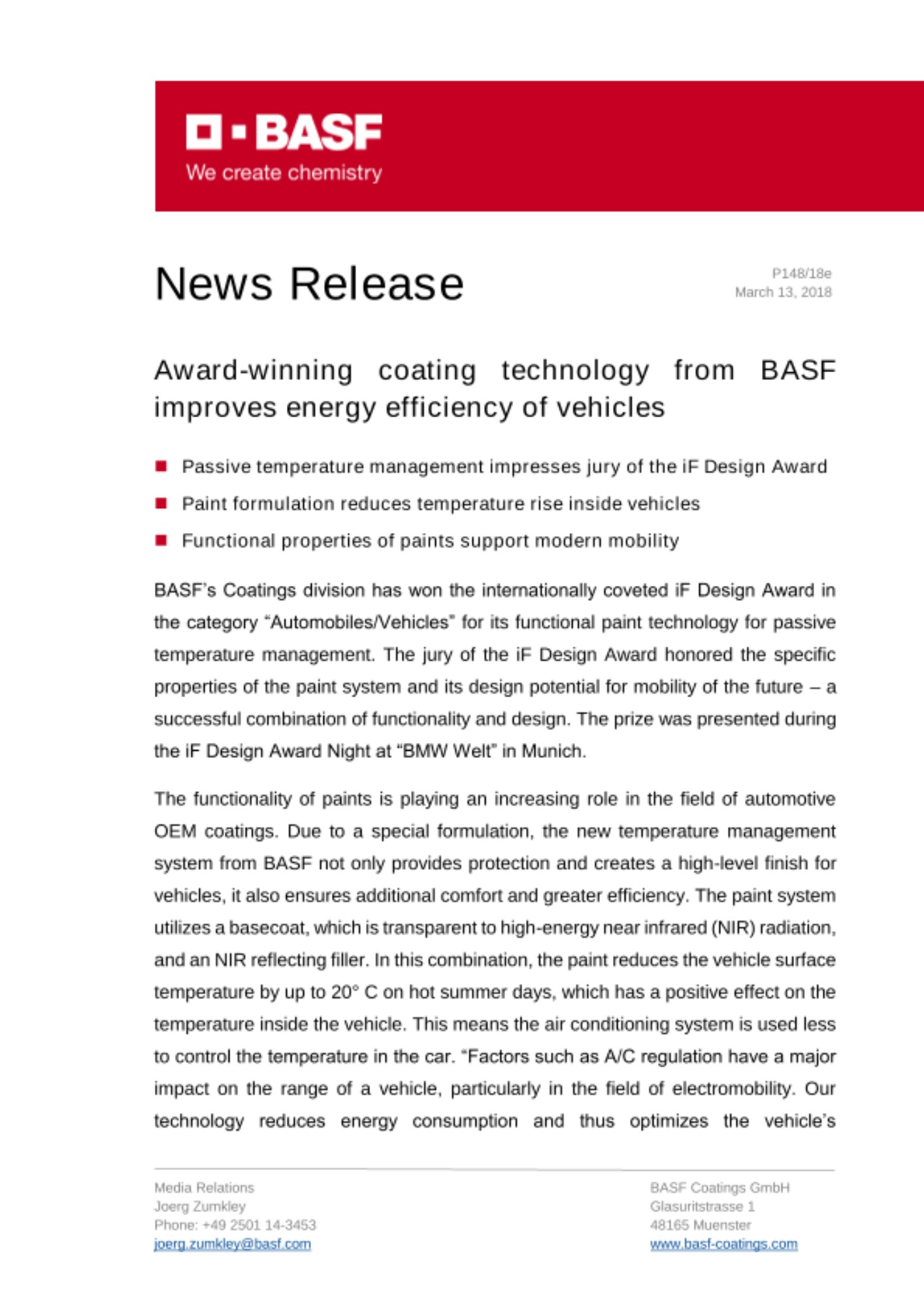 In addition to the functionality, the jury of the iF Design Award was also won over by the design potential of the paint technology. “Colors and special effects offer carmakers the opportunity to accentuate the shape of the vehicle and to give the model its unique character. Our temperature management system covers a wide color spectrum that incorporates both light and dark colors – without compromising product quality,” said Mark Gutjahr, head of Automotive Color Design EMEA at BASF.