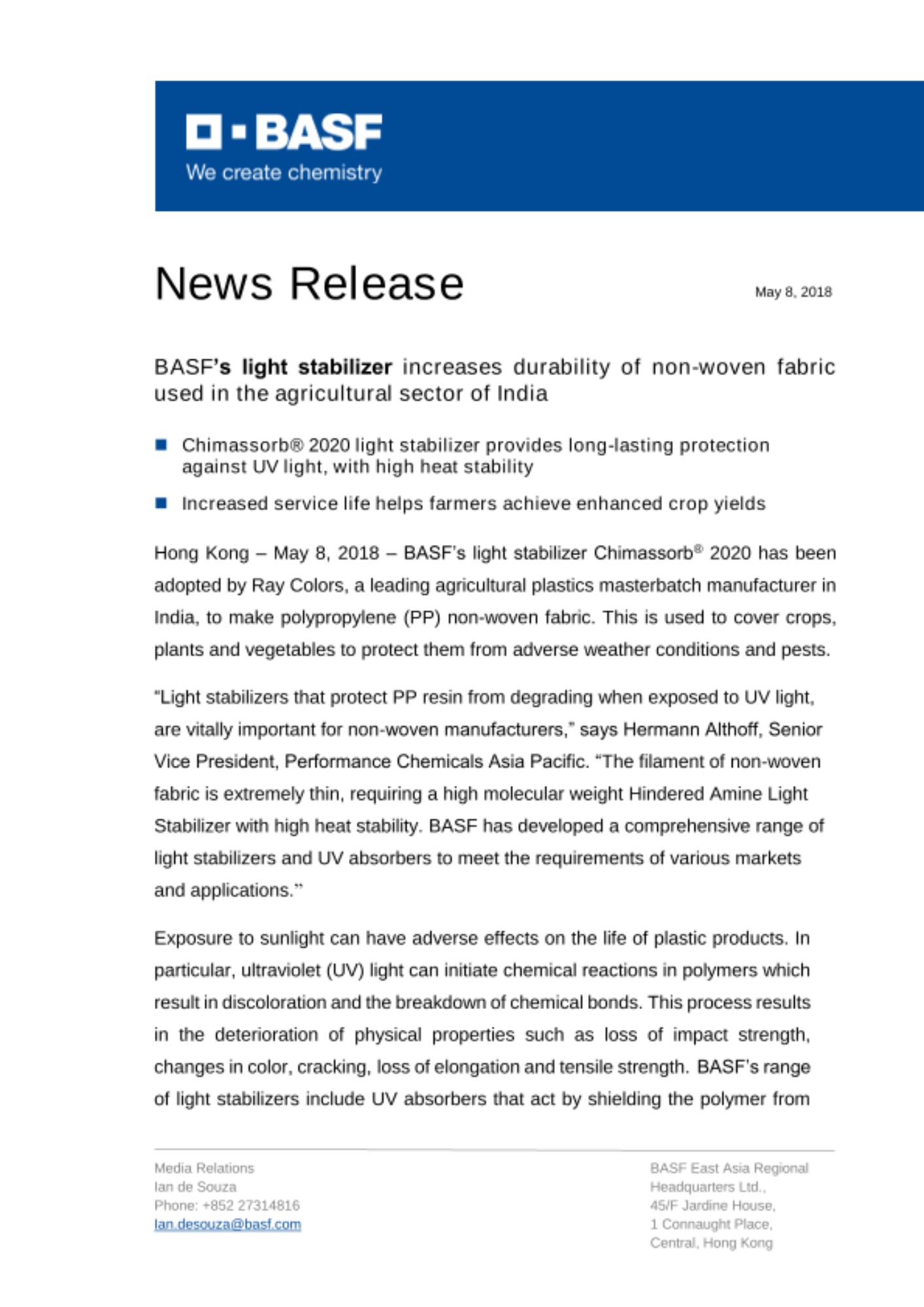 Hong Kong – May 8, 2018 – BASF’s light stabilizer Chimassorb® 2020 has been adopted by Ray Colors, a leading agricultural plastics masterbatch manufacturer in India, to make polypropylene (PP) non-woven fabric. This is used to cover crops, plants and vegetables to protect them from adverse weather conditions and pests.
