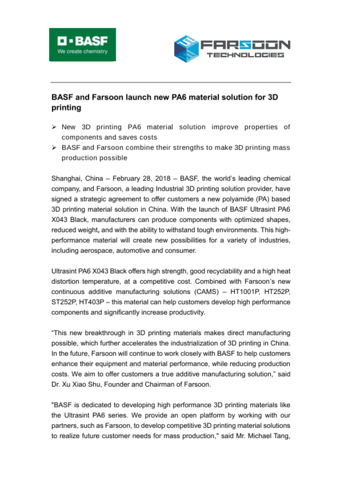 Shanghai, China – February 28, 2018 – BASF, the world’s leading chemical company, and Farsoon, a leading Industrial 3D printing solution provider, have signed a strategic agreement to offer customers a new polyamide (PA) based 3D printing material solution in China. With the launch of BASF Ultrasint PA6 X043 Black, manufacturers can produce components with optimized shapes, reduced weight, and with the ability to withstand tough environments. This high-performance material will create new possibilities for a variety of industries, including aerospace, automotive and consumer.