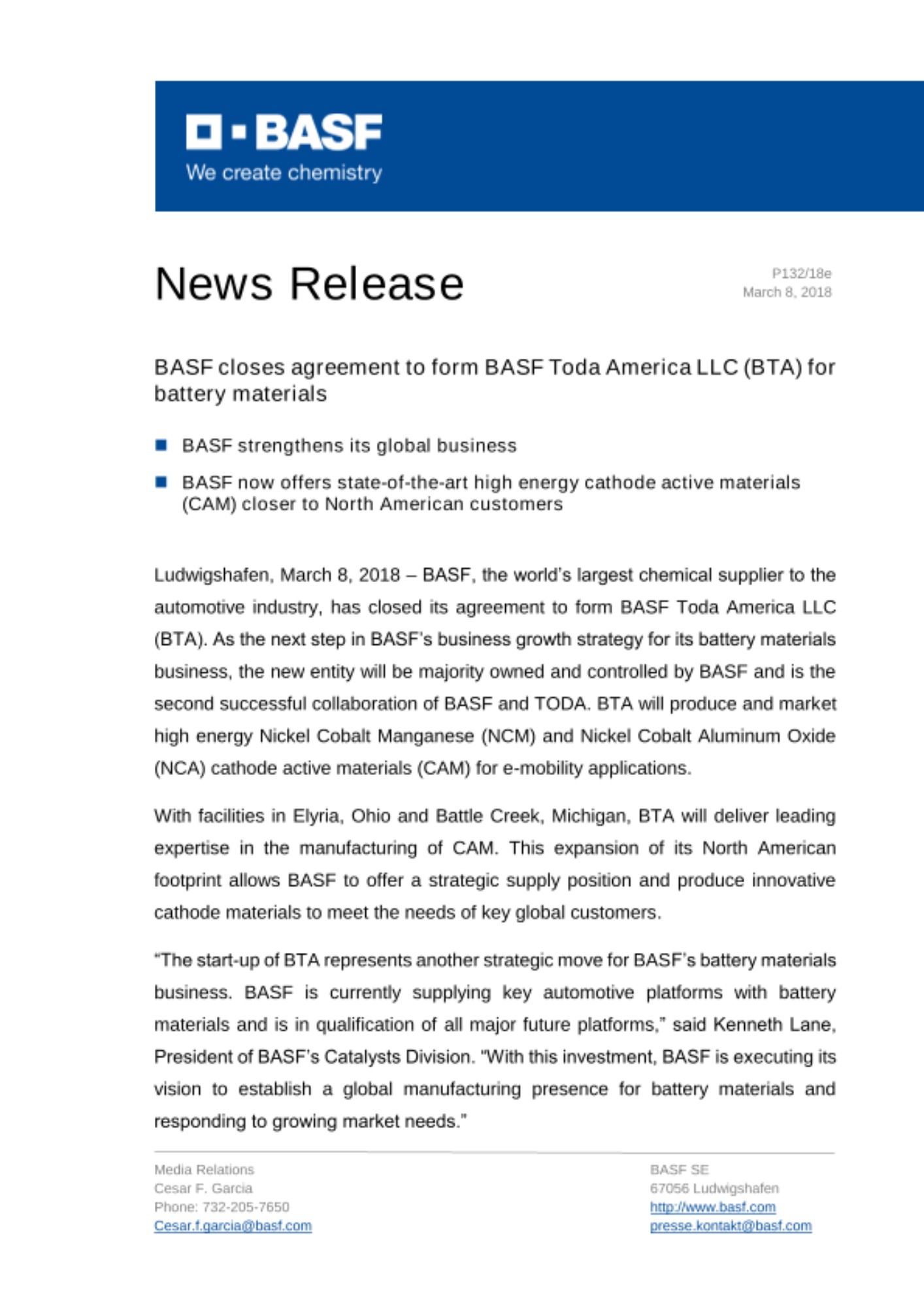Ludwigshafen, March 8, 2018 – BASF, the world’s largest chemical supplier to the automotive industry, has closed its agreement to form BASF Toda America LLC (BTA). As the next step in BASF’s business growth strategy for its battery materials business, the new entity will be majority owned and controlled by BASF and is the second successful collaboration of BASF and TODA. BTA will produce and market high energy Nickel Cobalt Manganese (NCM) and Nickel Cobalt Aluminum Oxide (NCA) cathode active materials (CAM) for e-mobility applications.