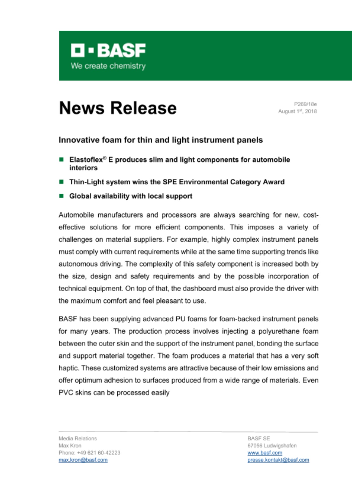 BASF has been supplying advanced PU foams for foam-backed instrument panels for many years. The production process involves injecting a polyurethane foam between the outer skin and the support of the instrument panel, bonding the surface and support material together. The foam produces a material that has a very soft haptic. These customized systems are attractive because of their low emissions and offer optimum adhesion to surfaces produced from a wide range of materials. Even PVC skins can be processed easily