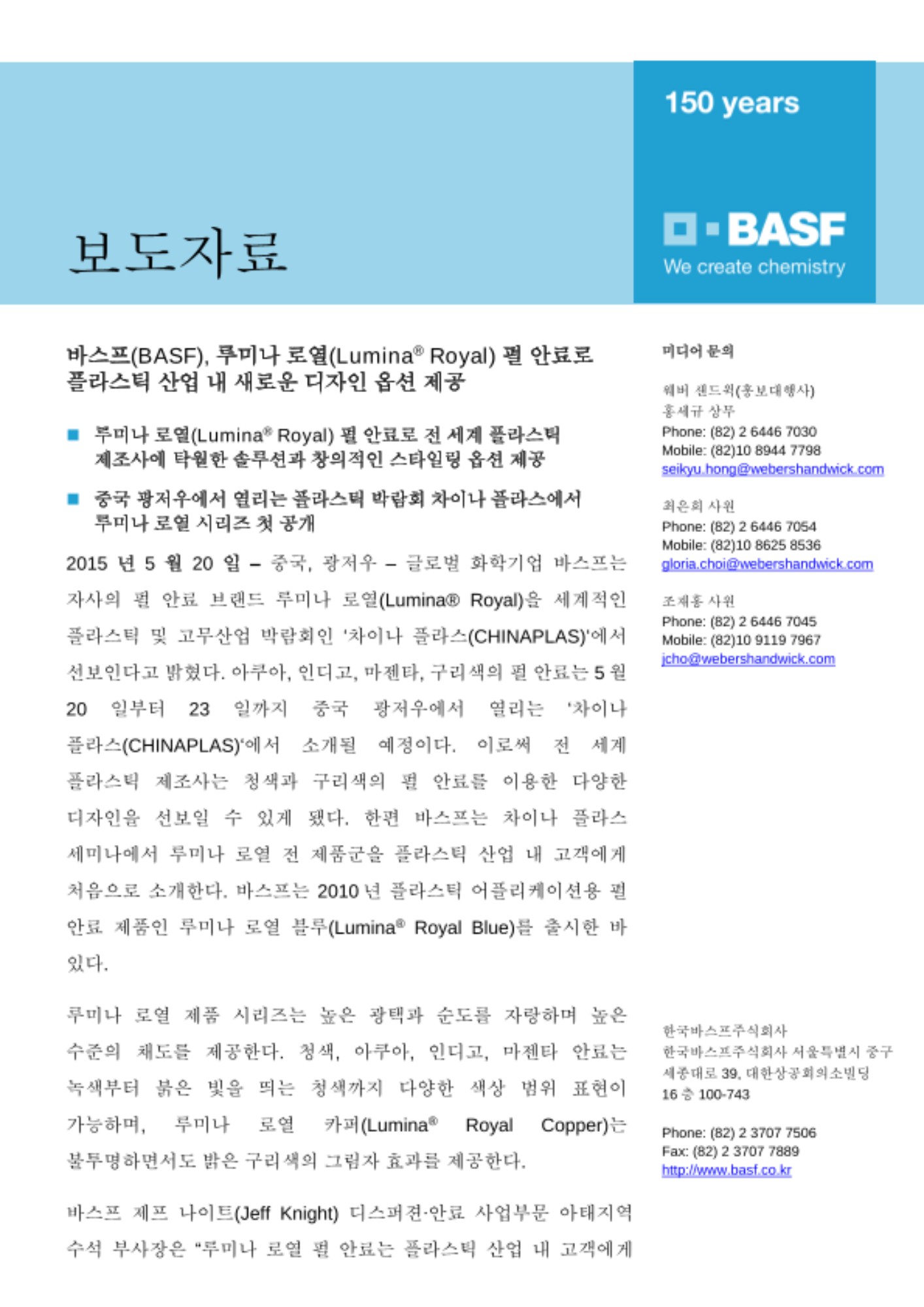 2015년 5월 20일 – 중국, 광저우 – 글로벌 화학기업 바스프는 자사의 펄 안료 브랜드 루미나 로열(Lumina® Royal)을 세계적인 플라스틱 및 고무산업 박람회인 ‘차이나 플라스(CHINAPLAS)‘에서 선보인다고 밝혔다. 아쿠아, 인디고, 마젠타, 구리색의 펄 안료는 5월 20일부터 23일까지 중국 광저우에서 열리는 ‘차이나 플라스(CHINAPLAS)‘에서 소개될 예정이다. 이로써 전 세계 플라스틱 제조사는 청색과 구리색의 펄 안료를 이용한 다양한 디자인을 선보일 수 있게 됐다. 한편 바스프는 차이나 플라스 세미나에서 루미나 로열 전 제품군을 플라스틱 산업 내 고객에게 처음으로 소개한다. 바스프는 2010년 플라스틱 어플리케이션용 펄 안료 제품인 루미나 로열 블루(Lumina® Royal Blue)를 출시한 바 있다.