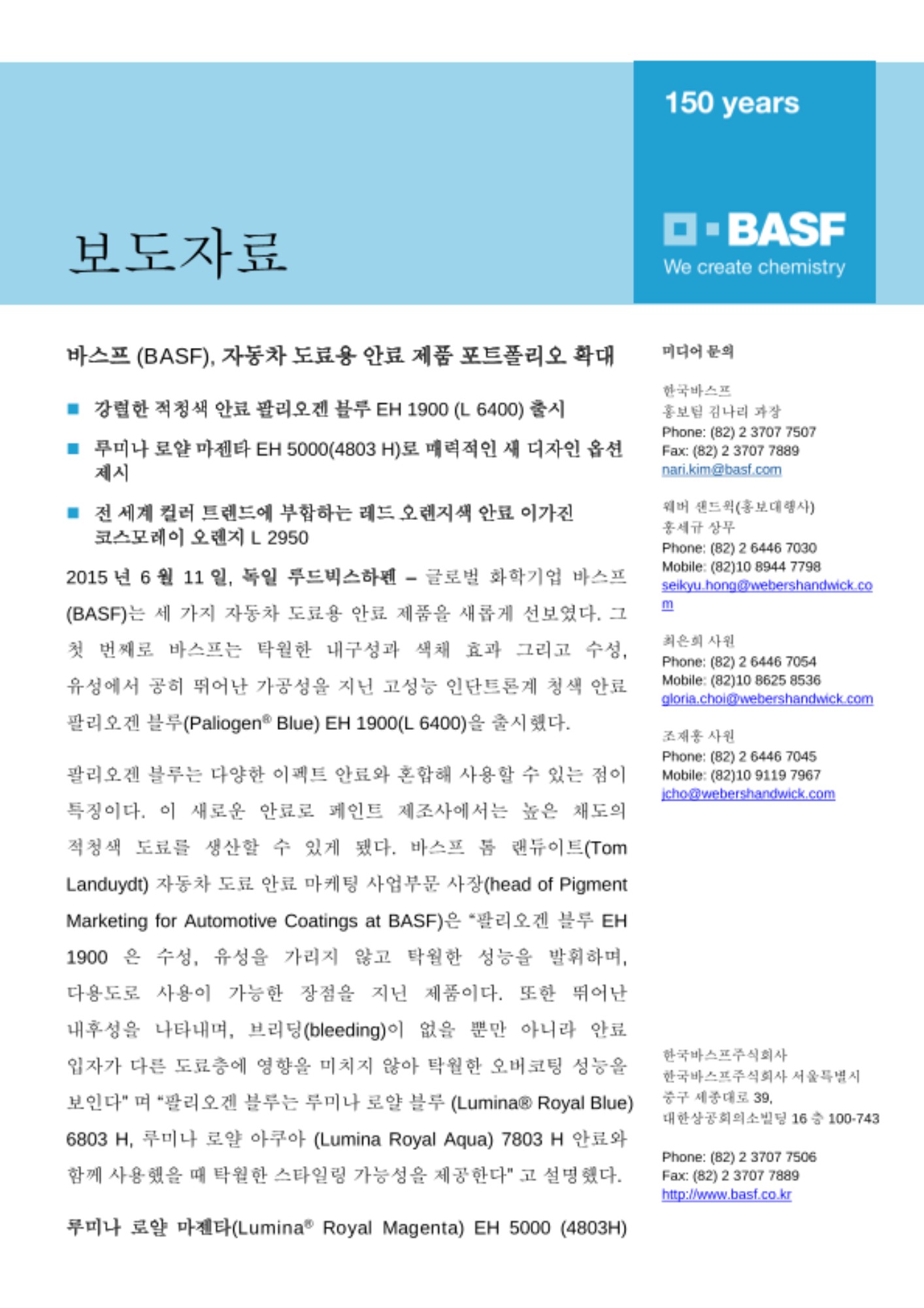 2015년 6월 11일, 독일 루드빅스하펜 – 글로벌 화학기업 바스프 (BASF)는 세 가지 자동차 도료용 안료 제품을 새롭게 선보였다. 그 첫 번째로 바스프는 탁월한 내구성과 색채 효과 그리고 수성, 유성에서 공히 뛰어난 가공성을 지닌 고성능 인단트론계 청색 안료 팔리오겐 블루(Paliogen® Blue) EH 1900(L 6400)을 출시했다.