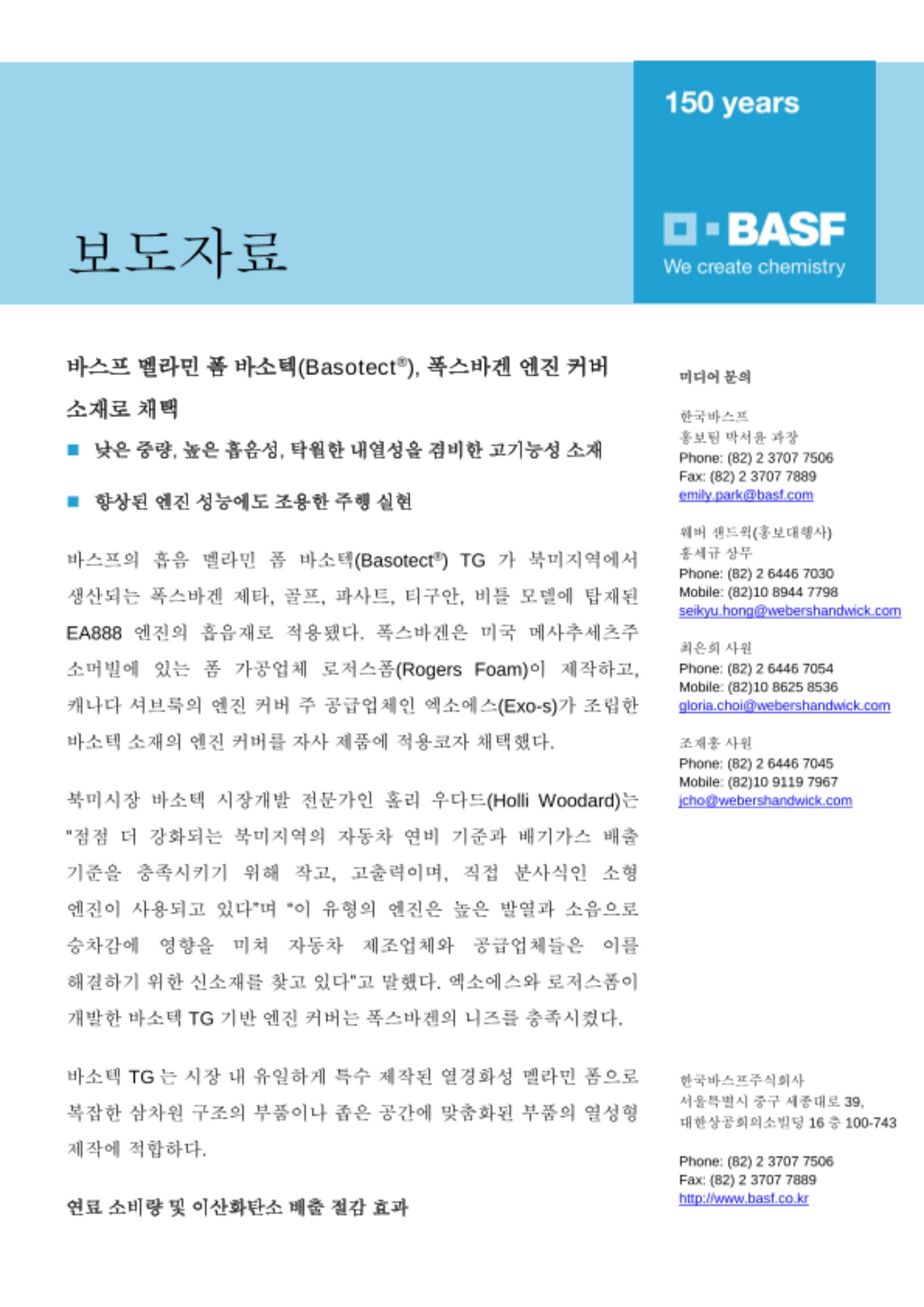 바스프의 흡음 멜라민 폼 바소텍(Basotect®) TG가 북미지역에서 생산되는 폭스바겐 제타, 골프, 파사트, 티구안, 비틀 모델에 탑재된 EA888 엔진의 흡음재로 적용됐다. 폭스바겐은 미국 메사추세츠주 소머빌에 있는 폼 가공업체 로저스폼(Rogers Foam)이 제작하고, 캐나다 셔브룩의 엔진 커버 주 공급업체인 엑소에스(Exo-s)가 조립한 바소텍 소재의 엔진 커버를 자사 제품에 적용코자 채택했다.