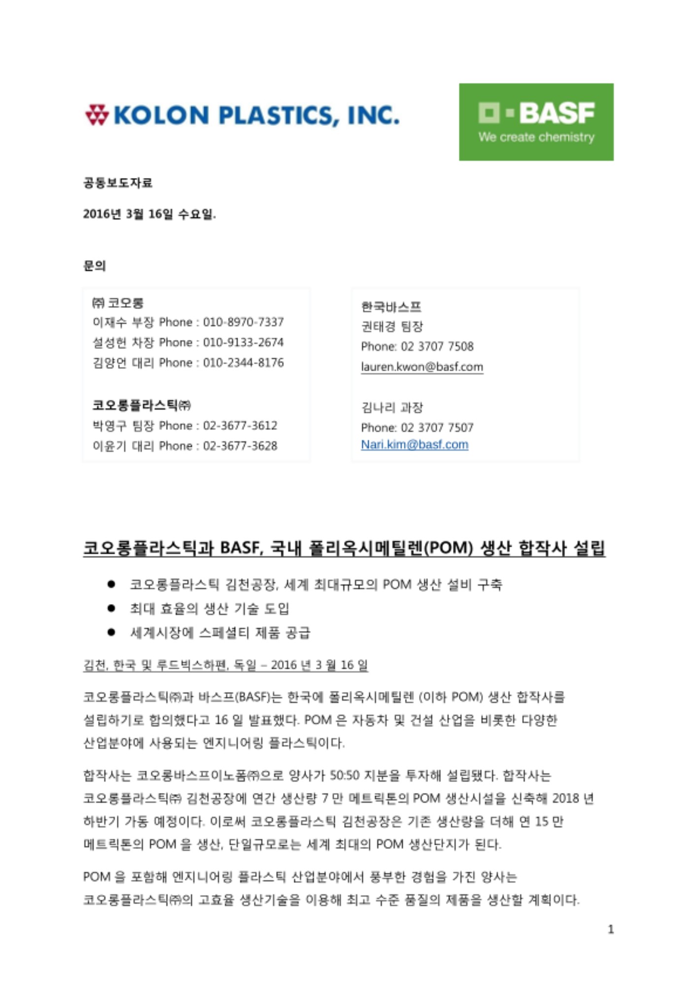코오롱플라스틱㈜과 바스프(BASF)는 한국에 폴리옥시메틸렌 (이하 POM) 생산 합작사를 설립하기로 합의했다고 16일 발표했다. POM은 자동차 및 건설 산업을 비롯한 다양한 산업분야에 사용되는 엔지니어링 플라스틱이다.