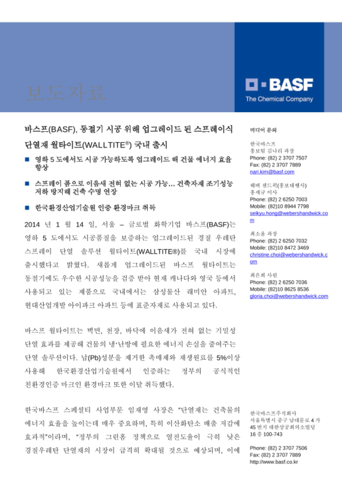 2014년 1월 14일, 서울 – 글로벌 화학기업 바스프(BASF)는 영하5도에서도 시공품질을 보증하는 업그레이드된 경질 우레탄 스프레이 단열 솔루션 월타이트(WALLTITE®)를 국내 시장에 출시했다고 밝혔다. 새롭게 업그레이드된 바스프 월타이트는 동절기에도 우수한 시공성능을 검증 받아 현재 캐나다와 영국 등에서 사용되고 있는 제품으로 국내에서는 삼성물산 래미안 아파트, 현대산업개발 아이파크 아파트 등에 표준자재로 사용되고 있다.