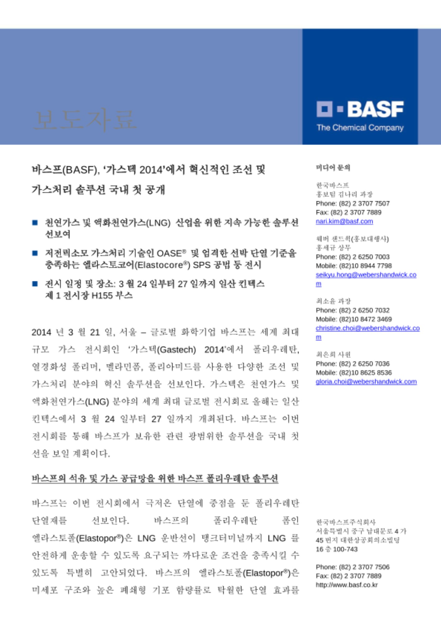 2014년 3월 21일, 서울 – 글로벌 화학기업 바스프는 세계 최대 규모 가스 전시회인 ‘가스텍(Gastech) 2014’에서 폴리우레탄, 열경화성 폴리머, 멜라민폼, 폴리아미드를 사용한 다양한 조선 및 가스처리 분야의 혁신 솔루션을 선보인다. 가스텍은 천연가스 및 액화천연가스(LNG) 분야의 세계 최대 글로벌 전시회로 올해는 일산 킨텍스에서 3월 24일부터 27일까지 개최된다. 바스프는 이번 전시회를 통해 바스프가 보유한 관련 광범위한 솔루션을 국내 첫 선을 보일 계획이다.