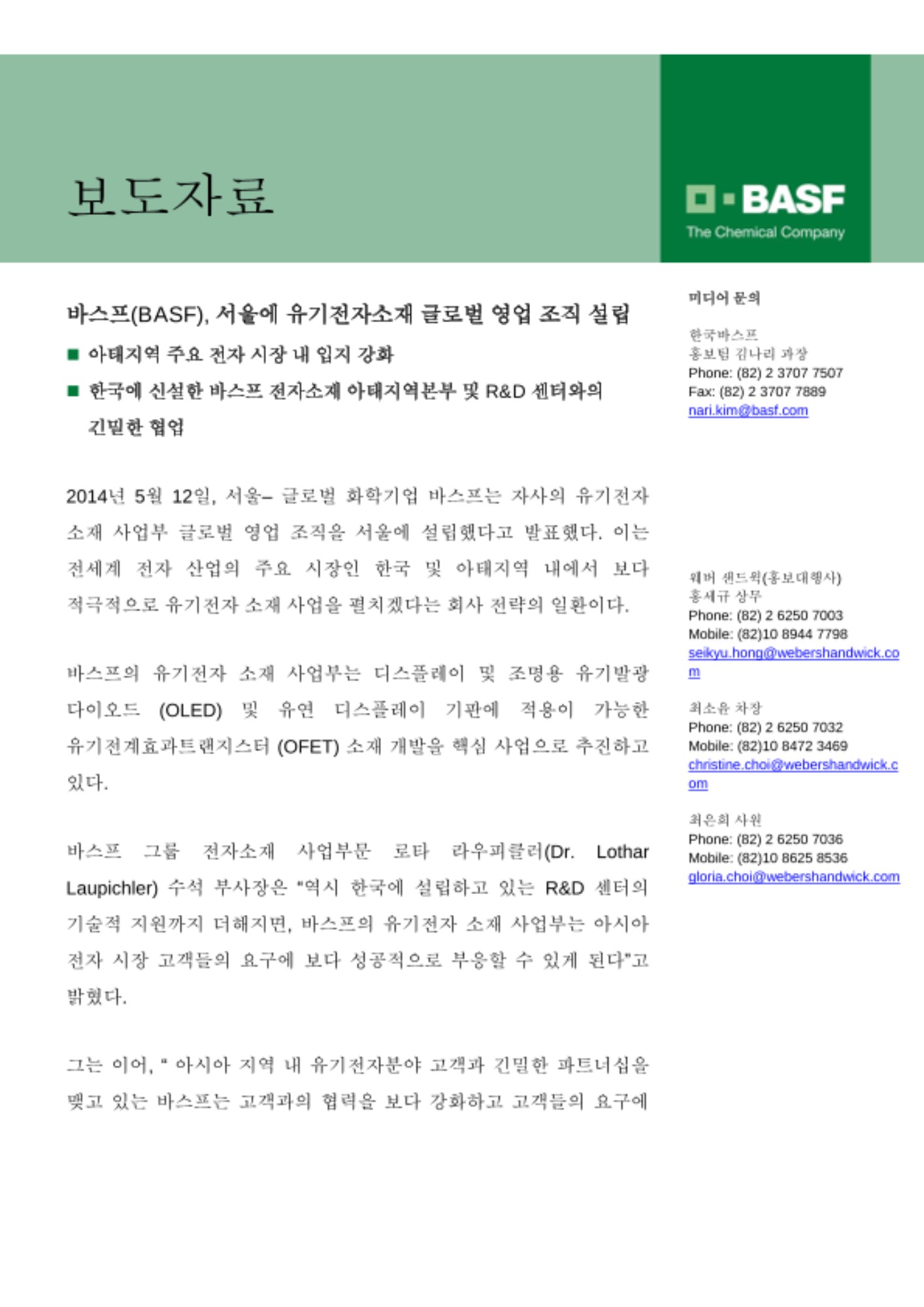 2014년 5월 12일, 서울– 글로벌 화학기업 바스프는 자사의 유기전자 소재 사업부 글로벌 영업 조직을 서울에 설립했다고 발표했다. 이는 전세계 전자 산업의 주요 시장인 한국 및 아태지역 내에서 보다 적극적으로 유기전자 소재 사업을 펼치겠다는 회사 전략의 일환이다.