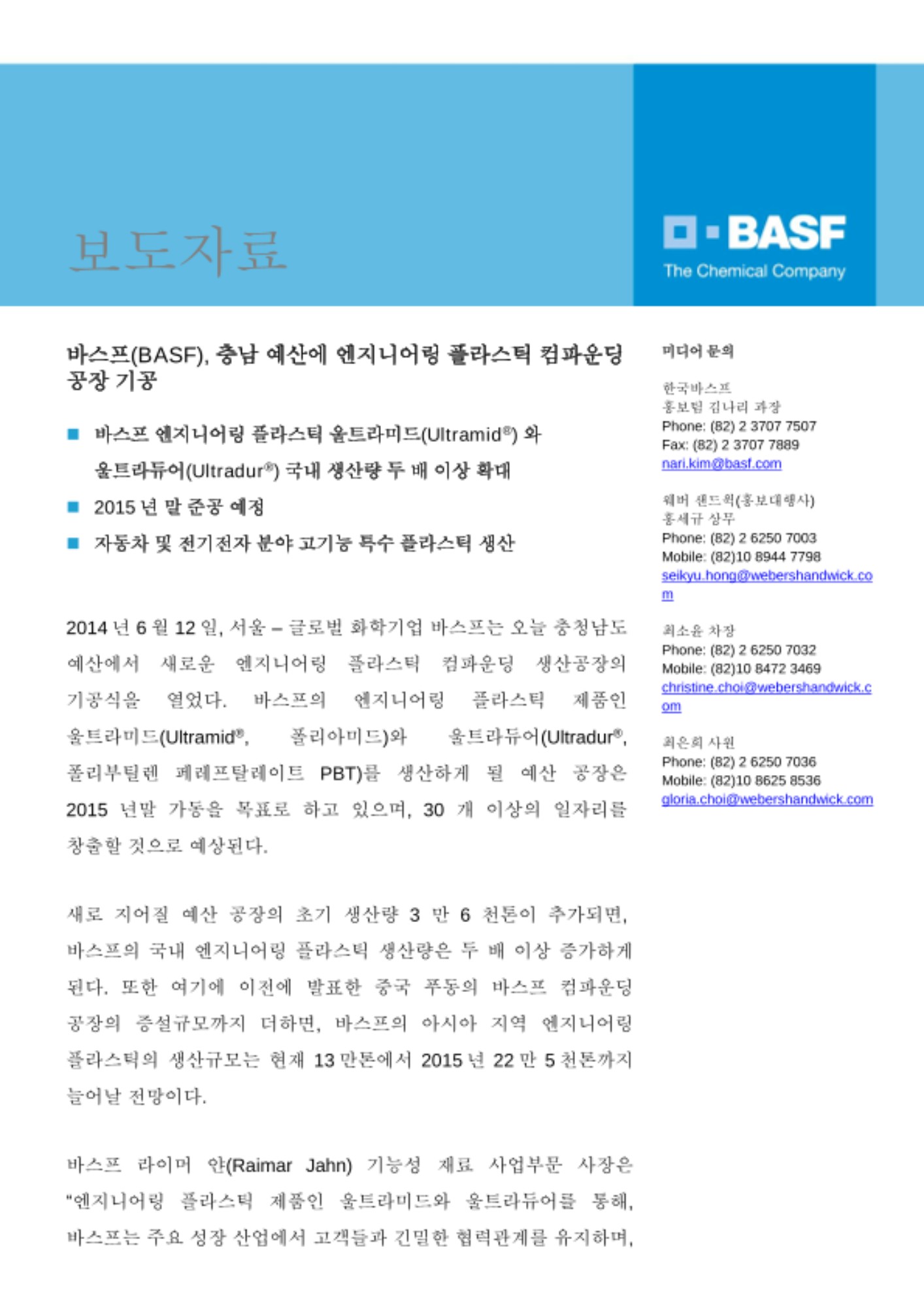 2014년 6월 12일, 서울 – 글로벌 화학기업 바스프는 오늘 충청남도 예산에서 새로운 엔지니어링 플라스틱 컴파운딩 생산공장의 기공식을 열었다. 바스프의 엔지니어링 플라스틱 제품인 울트라미드(Ultramid®, 폴리아미드)와 울트라듀어(Ultradur®, 폴리부틸렌 페레프탈레이트 PBT)를 생산하게 될 예산 공장은 2015년말 가동을 목표로 하고 있으며, 30개 이상의 일자리를 창출할 것으로 예상된다.