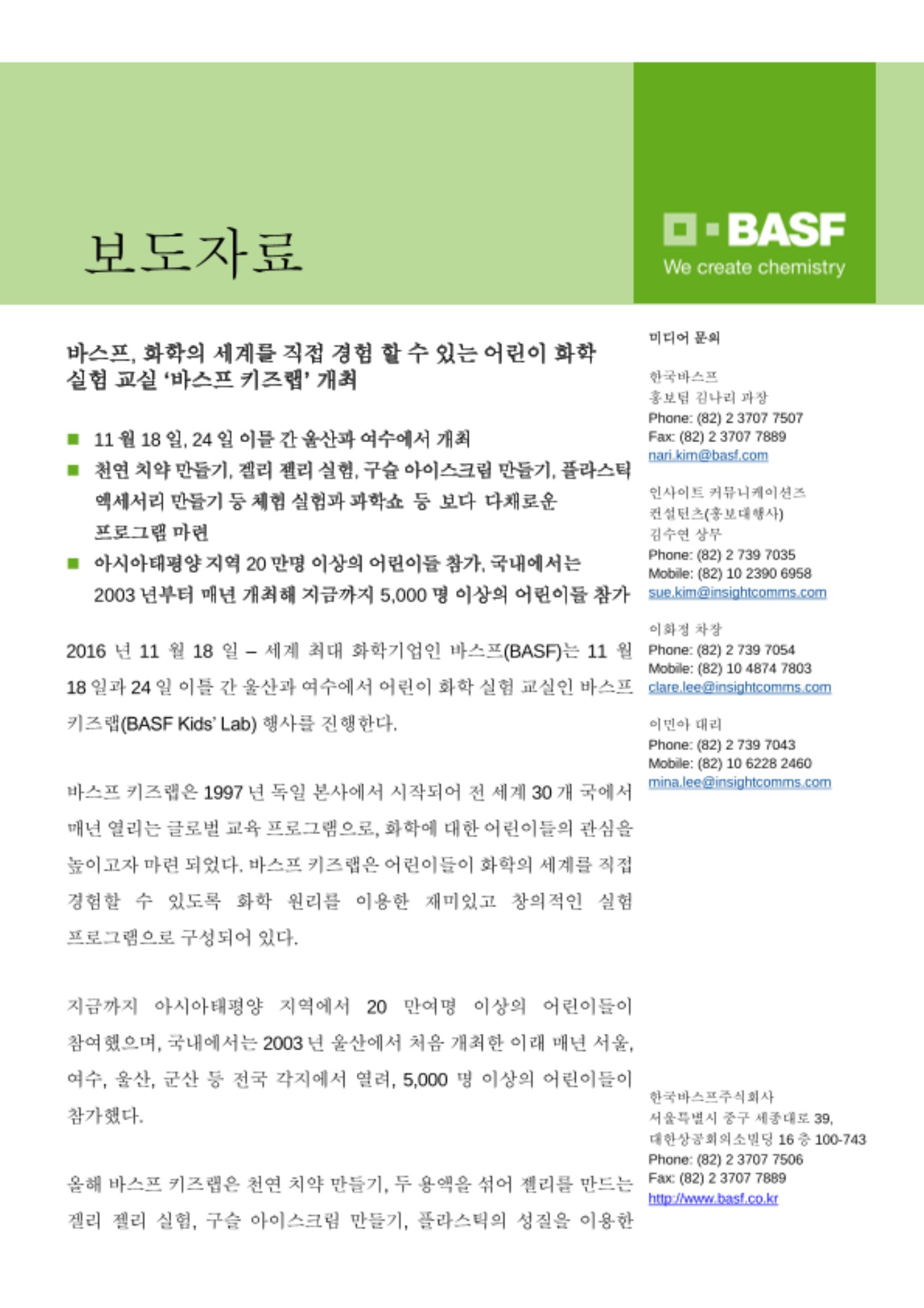 신우성 한국바스프 대표는 “올 해로 국내에서 13년 째 개최되고 있는 바스프 키즈랩은 어린이들이 화학의 중요성을 깨닫고, 화학을 통해 풍요로운 미래를 준비 할 수 있다는 점을 쉽고 재미있는 실험을 통해 배울 수 있는 대표적인 화학 실험 프로그램으로 자리매김 했다. 바스프는 앞으로도 지속적이고 장기적인 사회공헌 활동을 통해 지역사회 어린이들에게 꿈과 희망을 심어주고, 미래 인재를 양성하는데 기여 하고자 한다.”고 개최 소감을 밝혔다.