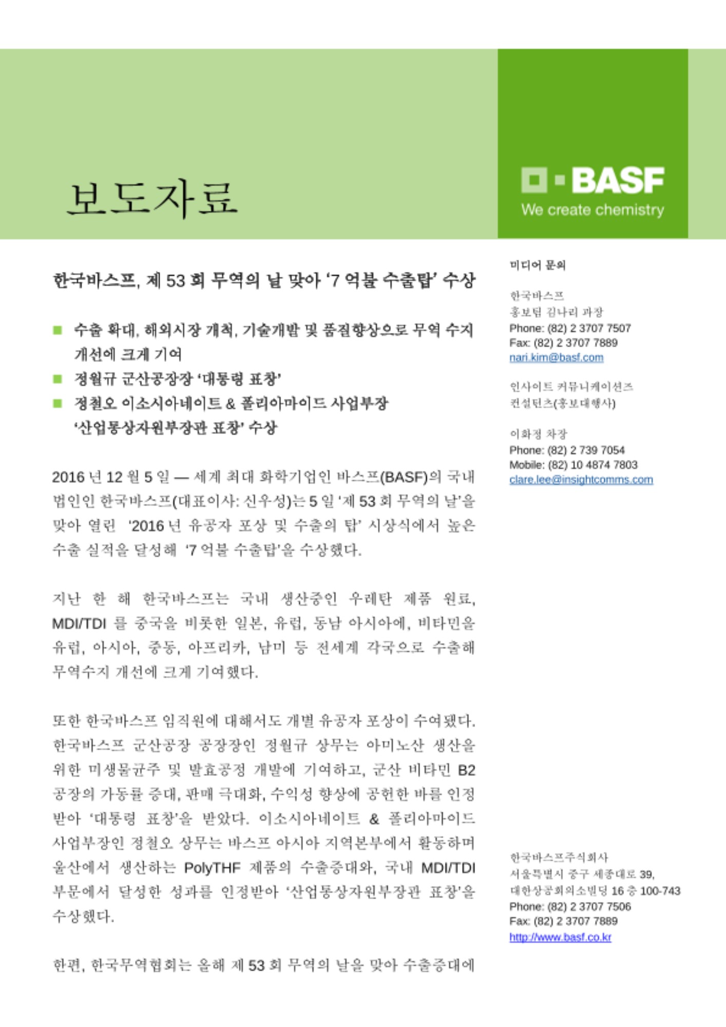 2016년 12월 5일 — 세계 최대 화학기업인 바스프(BASF)의 국내 법인인 한국바스프(대표이사: 신우성)는 5일 ‘제53회 무역의 날’을 맞아 열린 ‘2016년 유공자 포상 및 수출의 탑’ 시상식에서 높은 수출 실적을 달성해 ‘7억불 수출탑’을 수상했다.