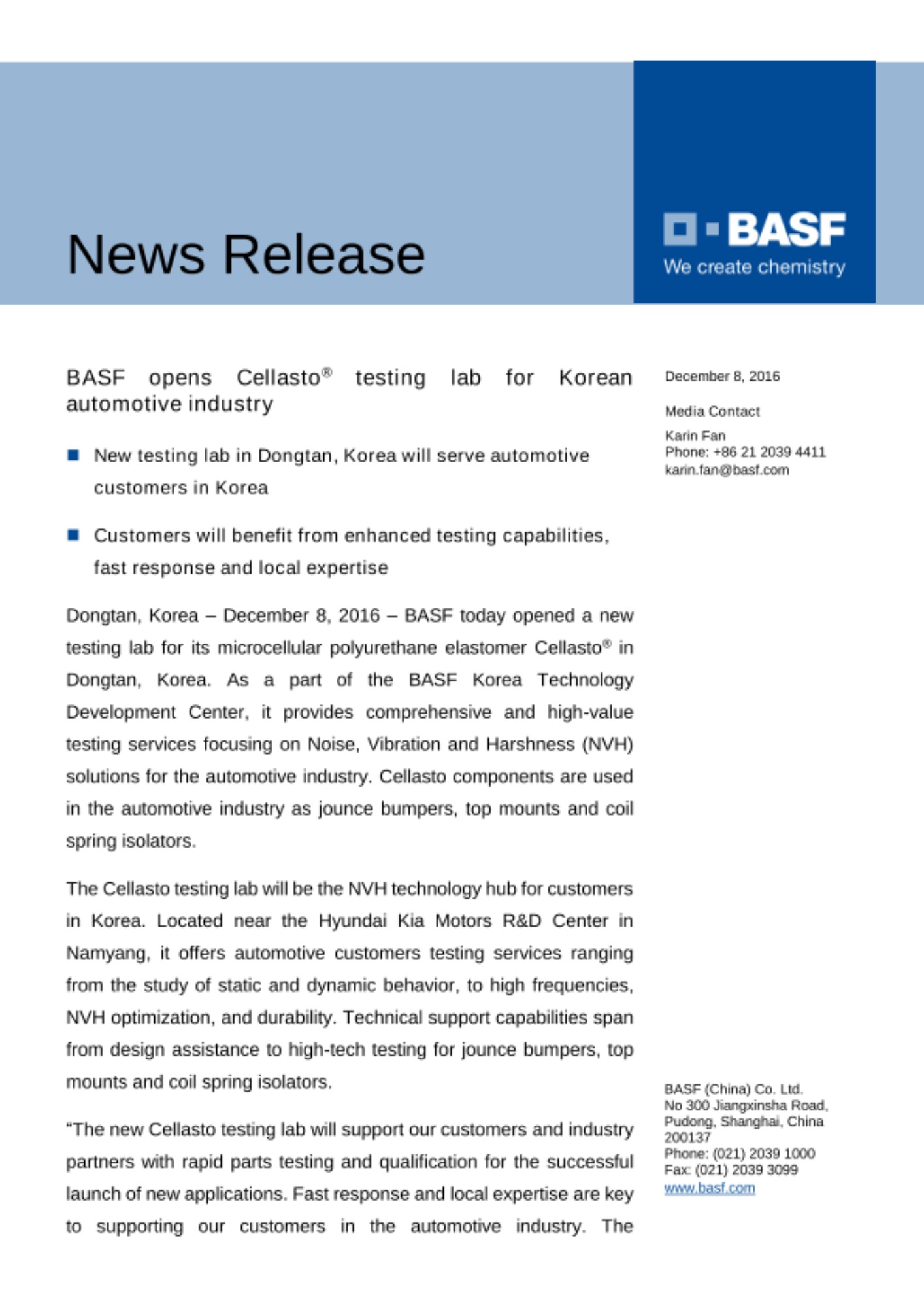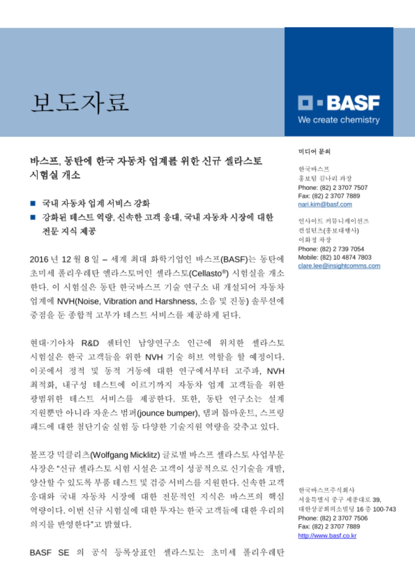 2016년 12월 8일 – 세계 최대 화학기업인 바스프(BASF)는 동탄에 초미세 폴리우레탄 엘라스토머인 셀라스토(Cellasto®) 시험실을 개소 한다. 이 시험실은 동탄 한국바스프 기술 연구소 내 개설되어 자동차 업계에 NVH(Noise, Vibration and Harshness, 소음 및 진동) 솔루션에 중점을 둔 종합적 고부가 테스트 서비스를 제공하게 된다.