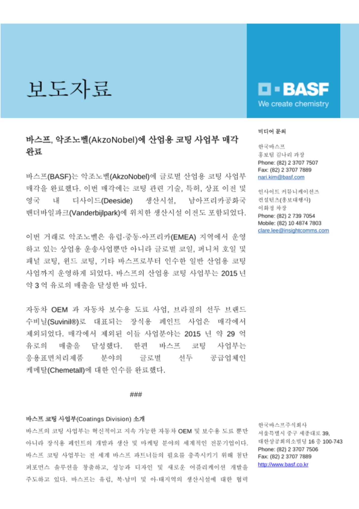 바스프(BASF)는 악조노벨(AkzoNobel)에 글로벌 산업용 코팅 사업부 매각을 완료했다. 이번 매각에는 코팅 관련 기술, 특허, 상표 이전 및 영국 내 디사이드(Deeside) 생산시설, 남아프리카공화국 밴더바일파크(Vanderbijlpark)에 위치한 생산시설 이전도 포함되었다.