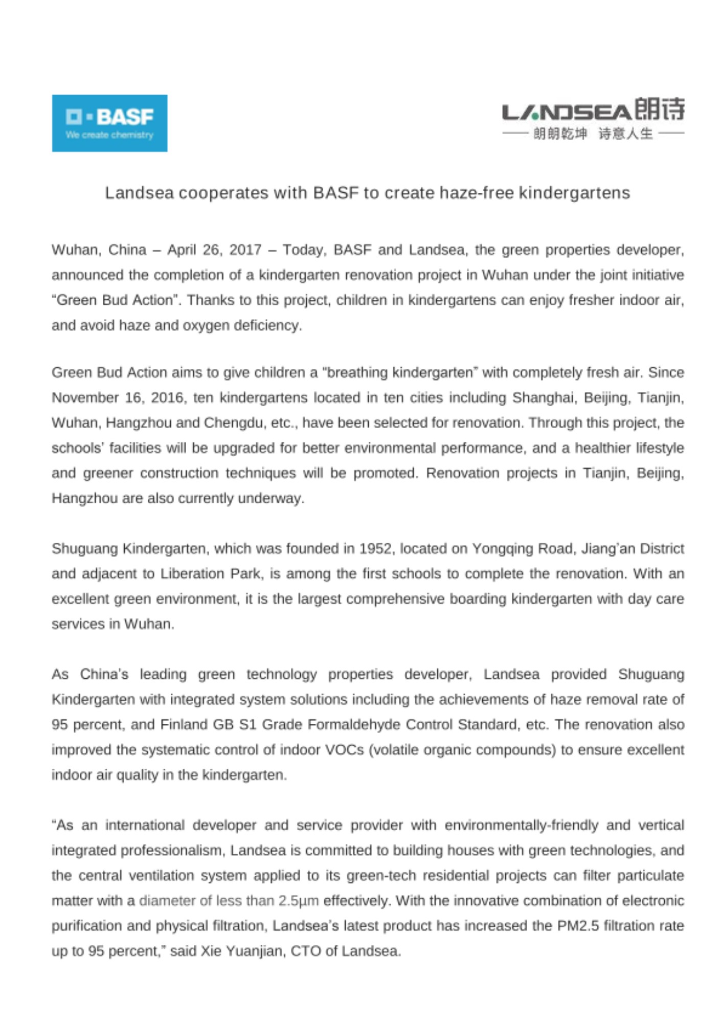 2017년 4월 28일 ㅡ 바스프(BASF)는 지난 26일, 중국의 친환경 부동산 개발 그룹 랜드씨(Landsea)와 공동으로 주관한 “녹색 새싹 운동 (Green Bud Action)” 프로젝트의 일환으로 우한(Wuhan) 지역의 한 유치원 개보수 공사를 완료했다고 발표했다.