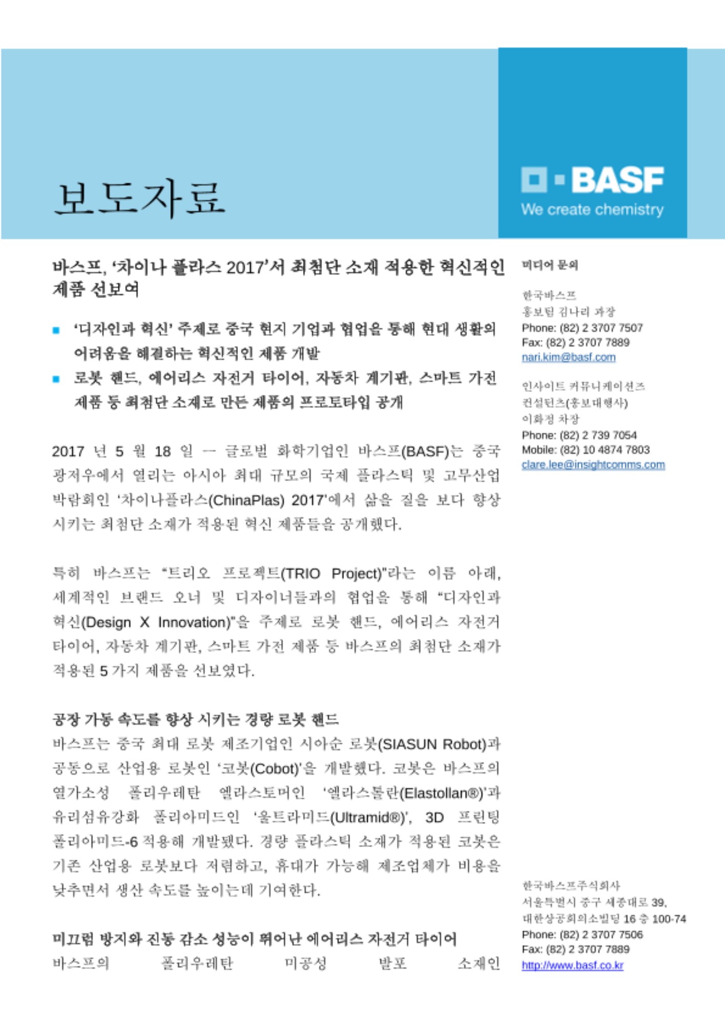 2017년 5월 18일 ㅡ 글로벌 화학기업인 바스프(BASF)는 중국 광저우에서 열리는 아시아 최대 규모의 국제 플라스틱 및 고무산업 박람회인 ‘차이나플라스(ChinaPlas) 2017’에서 삶을 질을 보다 향상 시키는 최첨단 소재가 적용된 혁신 제품들을 공개했다.