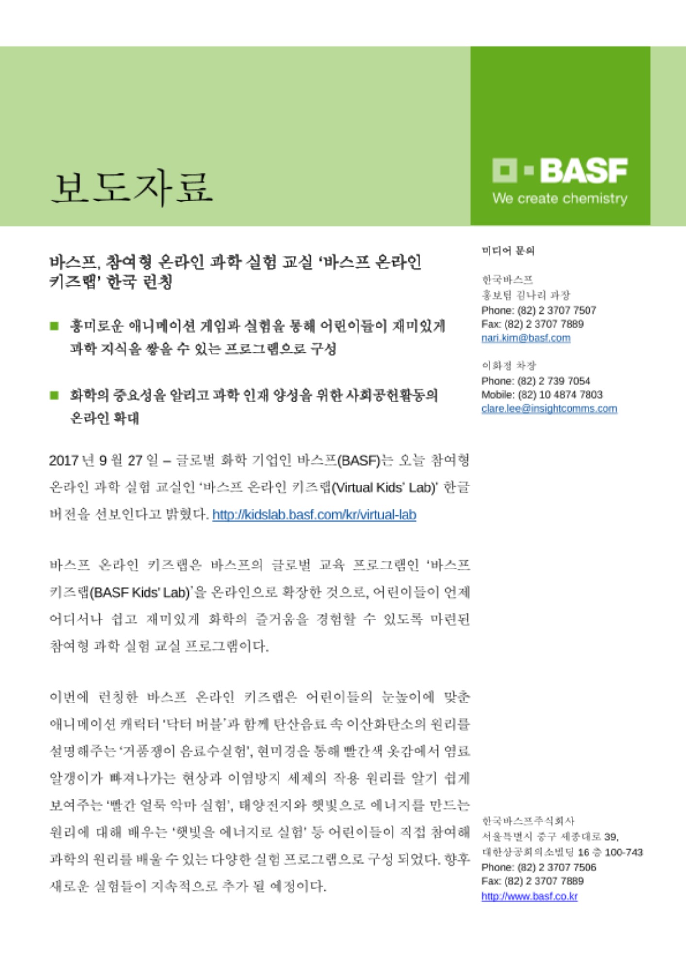 2017년 9월 27일 – 글로벌 화학 기업인 바스프(BASF)는 오늘 참여형 온라인 과학 실험 교실인 ‘바스프 온라인 키즈랩(Virtual Kids’ Lab)’ 한글 버전을 선보인다고 밝혔다. http://kidslab.basf.com/kr/virtual-lab
