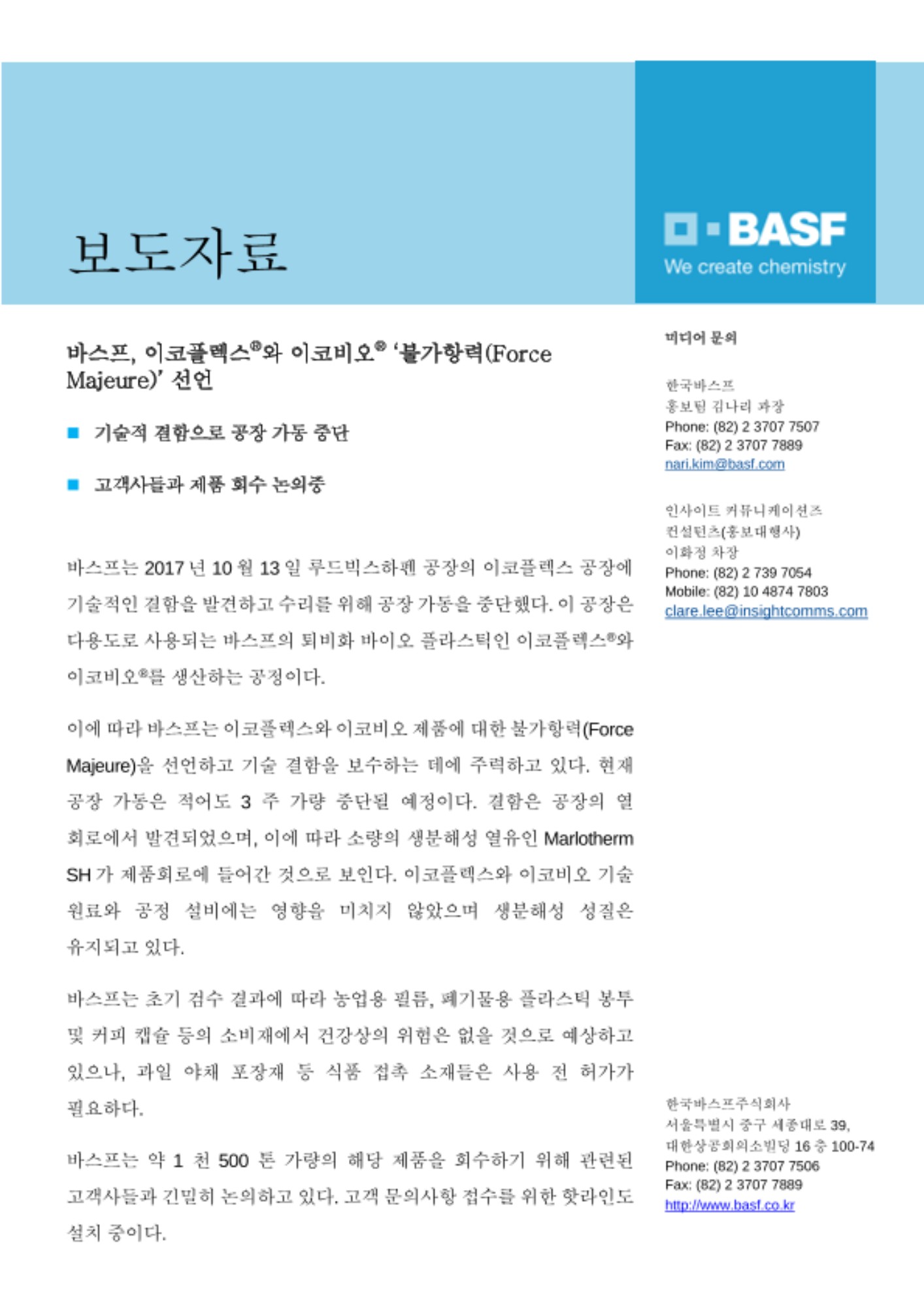 바스프, 이코플렉스®와 이코비오® ‘불가항력(Force Majeure)’ 선언
