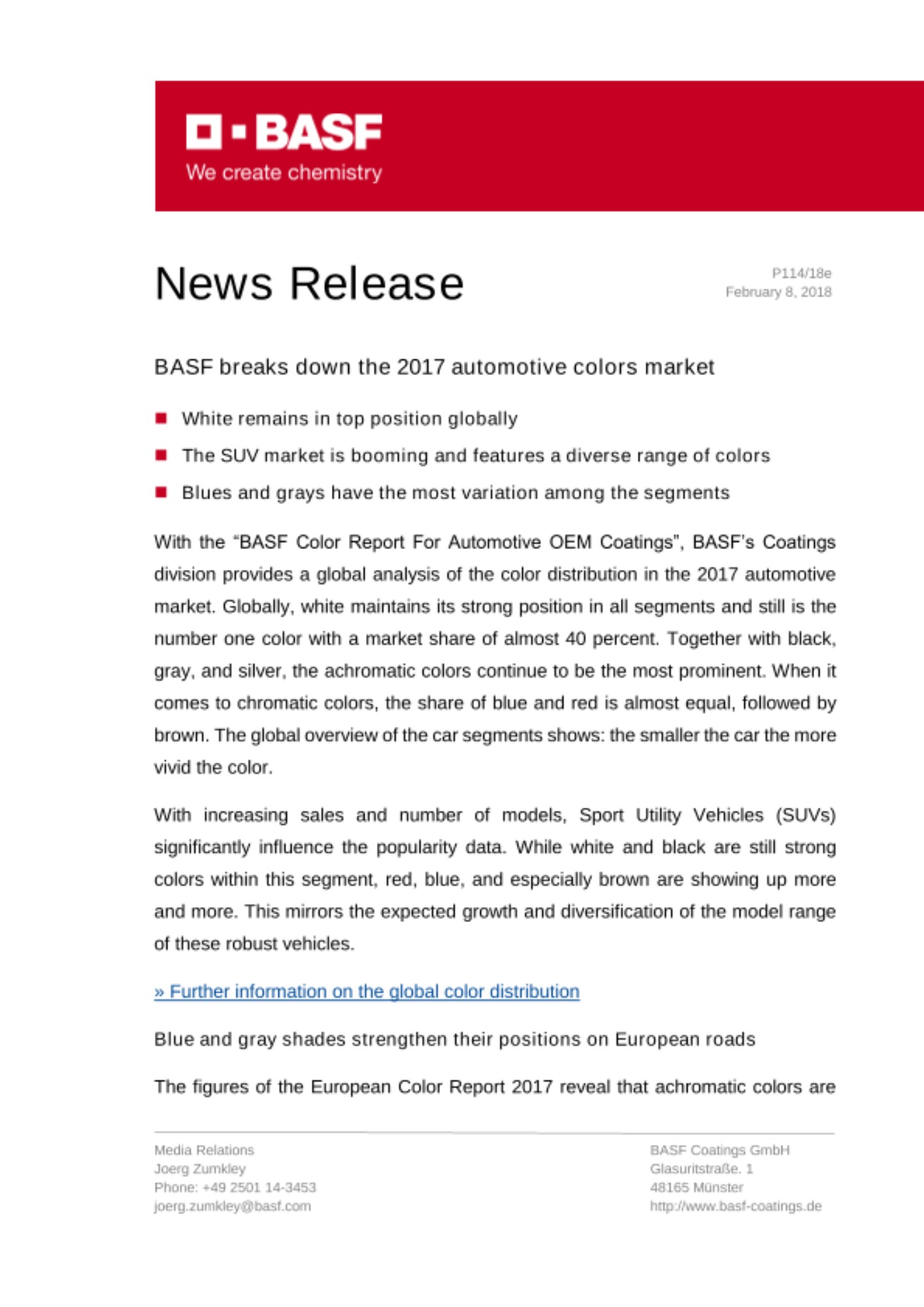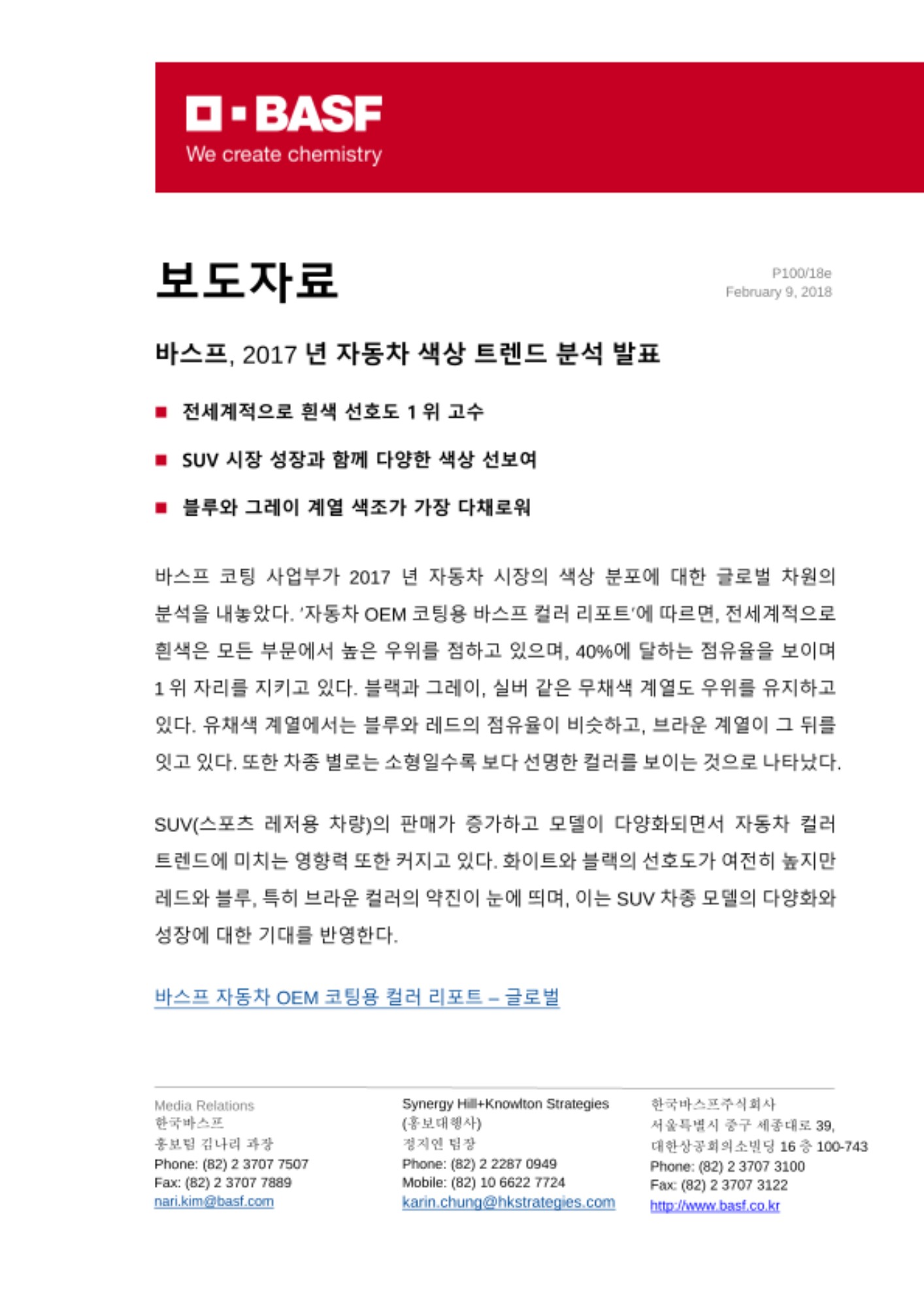 바스프 코팅 사업부가 2017년 자동차 시장의 색상 분포에 대한 글로벌 차원의 분석을 내놓았다. ‘자동차 OEM 코팅용 바스프 컬러 리포트’에 따르면, 전세계적으로 흰색은 모든 부문에서 높은 우위를 점하고 있으며, 40%에 달하는 점유율을 보이며 1위 자리를 지키고 있다. 블랙과 그레이, 실버 같은 무채색 계열도 우위를 유지하고 있다. 유채색 계열에서는 블루와 레드의 점유율이 비슷하고, 브라운 계열이 그 뒤를 잇고 있다. 또한 차종 별로는 소형일수록 보다 선명한 컬러를 보이는 것으로 나타났다.