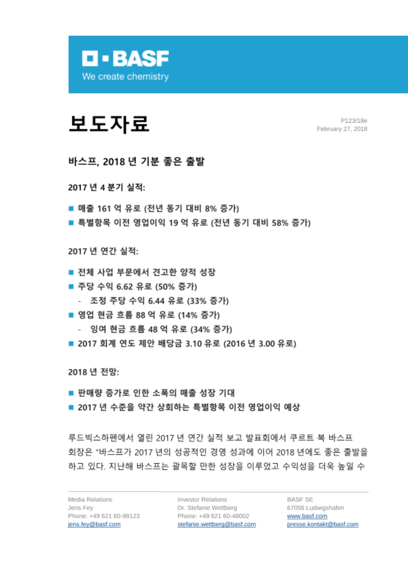 루드빅스하펜에서 열린 2017년 연간 실적 보고 발표회에서 쿠르트 복 바스프 회장은 “바스프가 2017년의 성공적인 경영 성과에 이어 2018년에도 좋은 출발을 하고 있다. 지난해 바스프는 괄목할 만한 성장을 이루었고 수익성을 더욱 높일 수 있었다. 또한 인력과 전략, 양면에서 바스프의 미래 발전을 위한 중요한 토대를 마련했다”고 말했다.