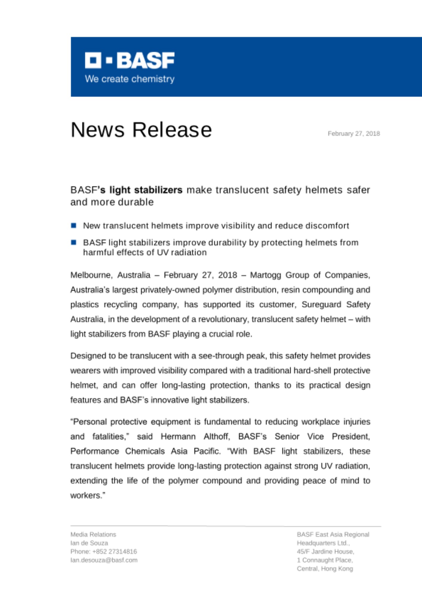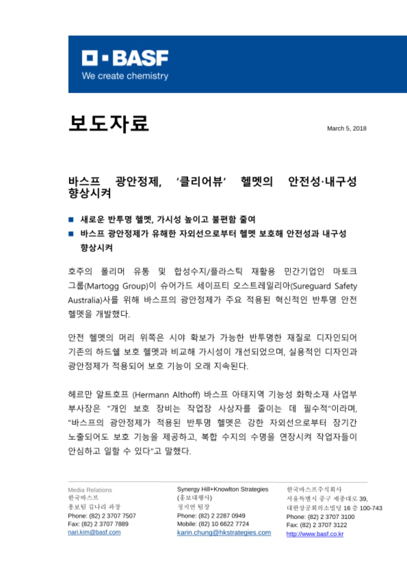 헤르만 알트호프 (Hermann Althoff) 바스프 아태지역 기능성 화학소재 사업부 부사장은 "개인 보호 장비는 작업장 사상자를 줄이는 데 필수적“이라며, "바스프의 광안정제가 적용된 반투명 헬멧은 강한 자외선으로부터 장기간 노출되어도 보호 기능을 제공하고, 복합 수지의 수명을 연장시켜 작업자들이 안심하고 일할 수 있다“고 말했다.