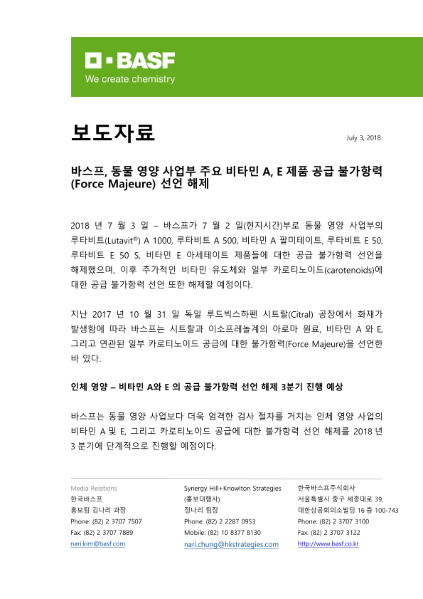 2018년 7월 3일 – 바스프가 7월 2일(현지시간)부로 동물 영양 사업부의 루타비트(Lutavit®) A 1000, 루타비트 A 500, 비타민 A 팔미테이트, 루타비트 E 50, 루타비트 E 50 S, 비타민 E 아세테이트 제품들에 대한 공급 불가항력 선언을 해제했으며, 이후 추가적인 비타민 유도체와 일부 카로티노이드(carotenoids)에 대한 공급 불가항력 선언 또한 해제할 예정이다.
