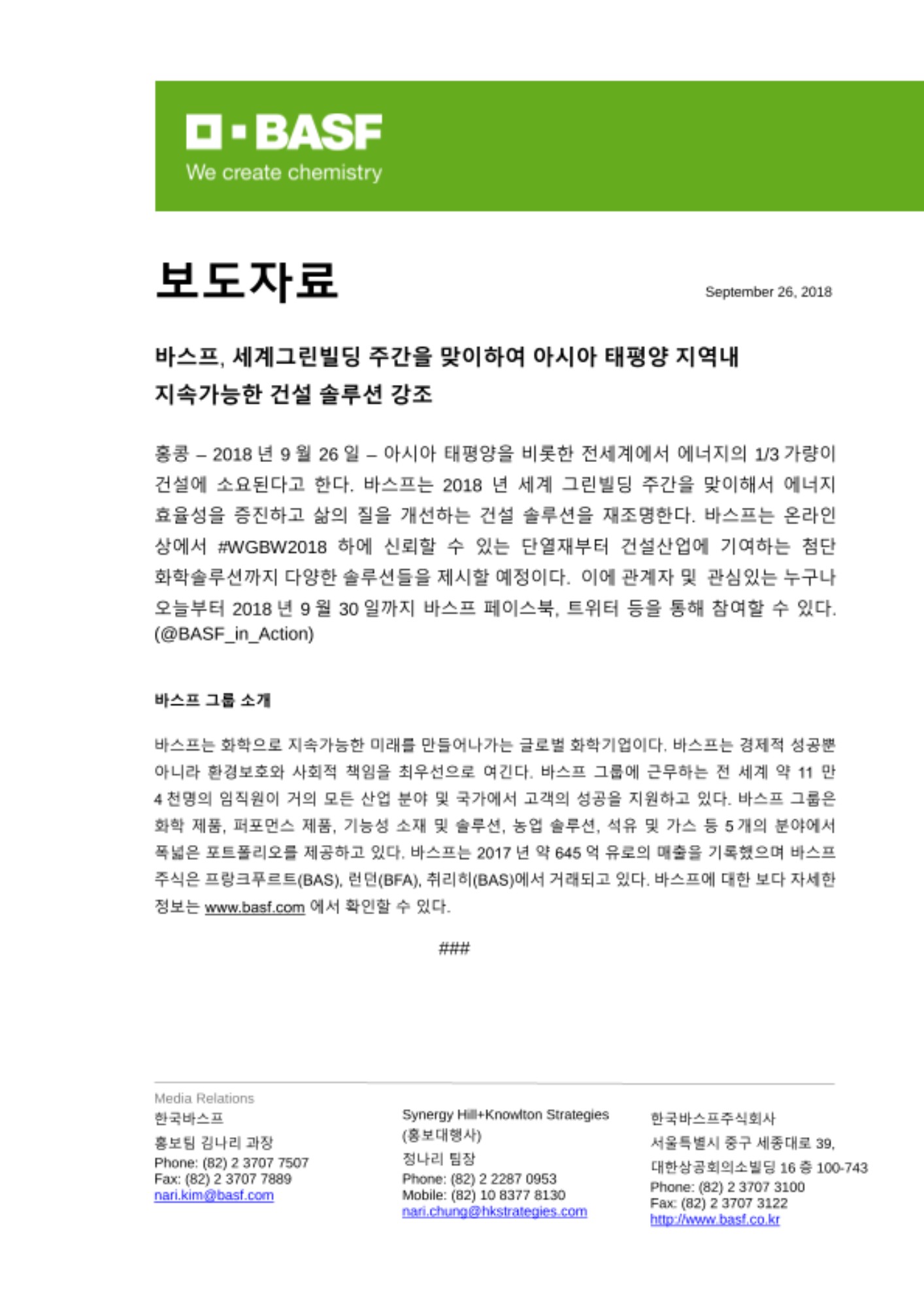홍콩 – 2018년 9월 26일 – 아시아 태평양을 비롯한 전세계에서 에너지의 1/3가량이 건설에 소요된다고 한다. 바스프는 2018년 세계 그린빌딩 주간을 맞이해서 에너지 효율성을 증진하고 삶의 질을 개선하는 건설 솔루션을 재조명한다. 바스프는 온라인 상에서 #WGBW2018 하에 신뢰할 수 있는 단열재부터 건설산업에 기여하는 첨단 화학솔루션까지 다양한 솔루션들을 제시할 예정이다. 이에 관계자 및 관심있는 누구나 오늘부터 2018년 9월 30일까지 바스프 페이스북, 트위터 등을 통해 참여할 수 있다. (@BASF_in_Action)