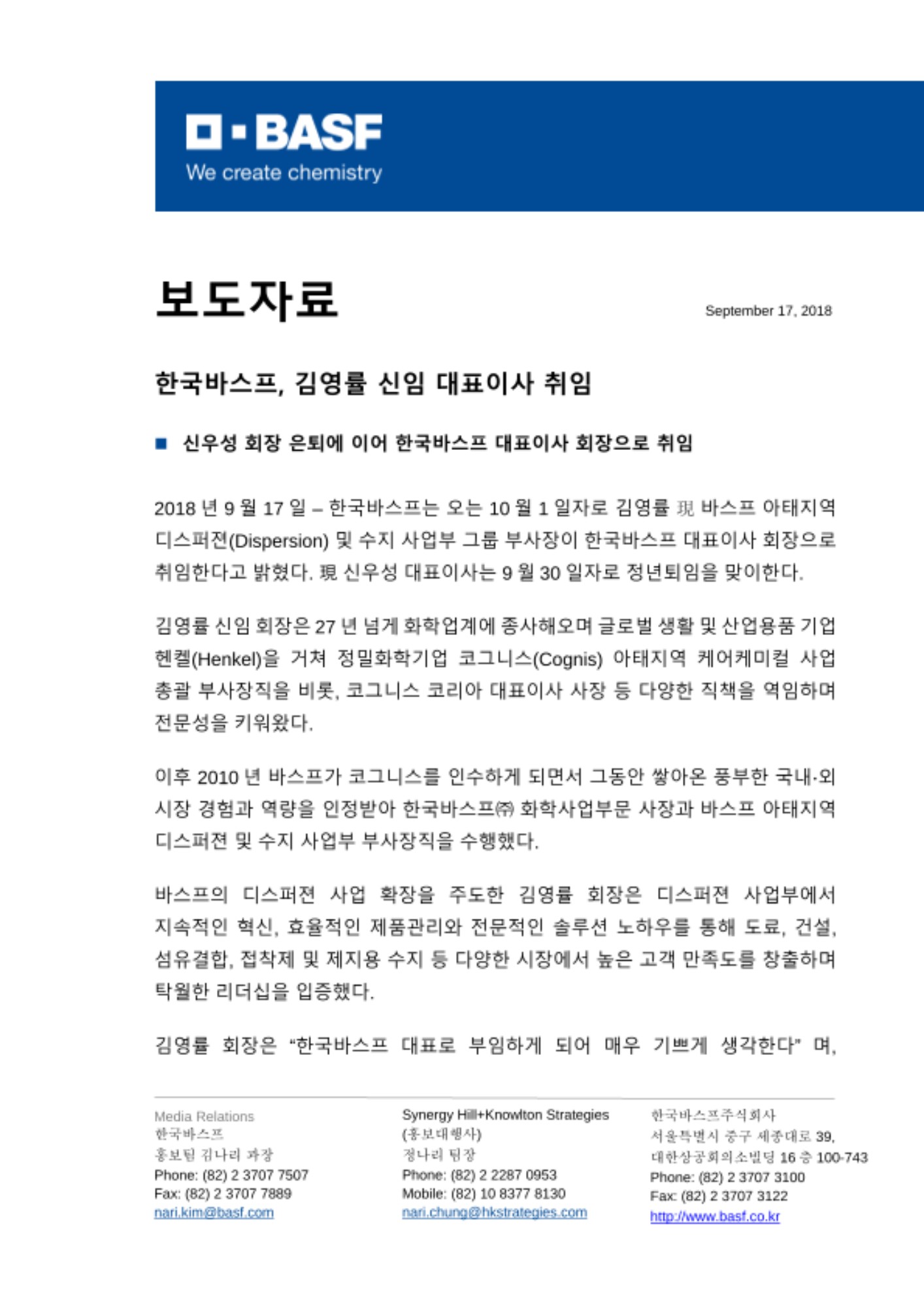 2018년 9월 17일 – 한국바스프는 오는 10월 1일자로 김영률 現 바스프 아태지역 디스퍼젼(Dispersion) 및 수지 사업부 그룹 부사장이 한국바스프 대표이사 회장으로 취임한다고 밝혔다. 現 신우성 대표이사는 9월30일자로 정년퇴임을 맞이한다.