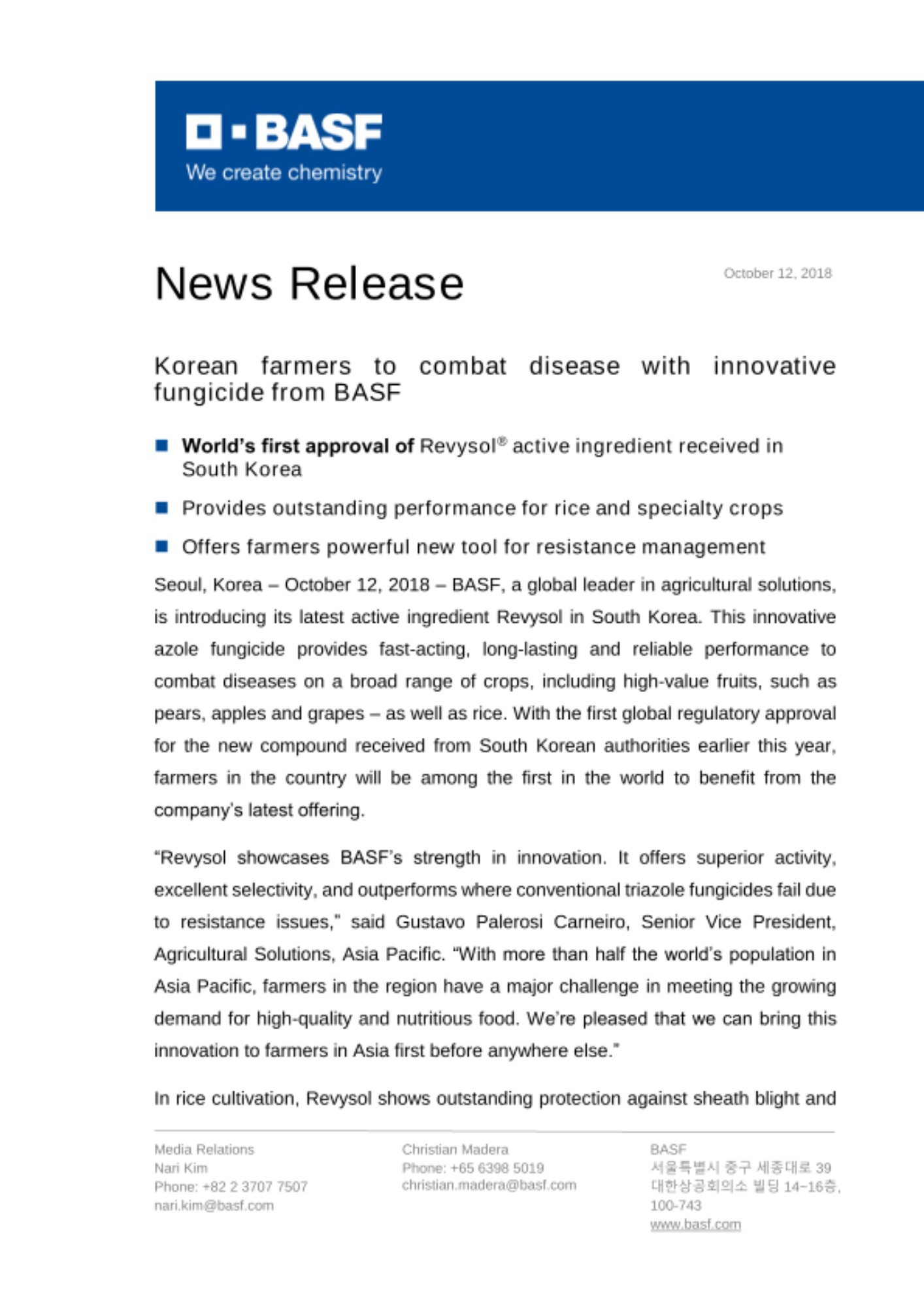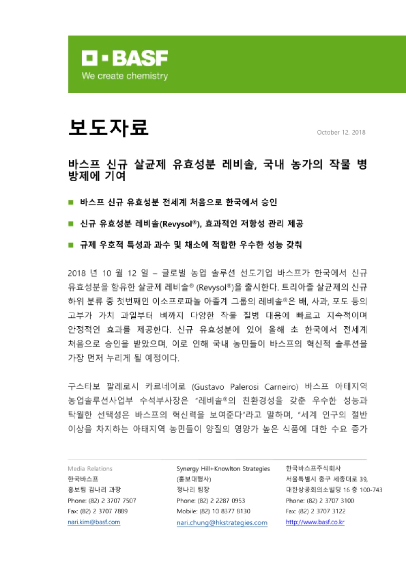 2018년 10월 12일 – 글로벌 농업 솔루션 선도기업 바스프가 한국에서 신규 유효성분을 함유한 살균제 레비솔® (Revysol®)을 출시한다. 트리아졸 살균제의 신규 하위 분류 중 첫번째인 이소프로파놀 아졸계 그룹의 레비솔®은 배, 사과, 포도 등의 고부가 가치 과일부터 벼까지 다양한 작물 질병 대응에 빠르고 지속적이며 안정적인 효과를 제공한다. 신규 유효성분에 있어 올해 초 한국에서 전세계 처음으로 승인을 받았으며, 이로 인해 국내 농민들이 바스프의 혁신적 솔루션을 가장 먼저 누리게 될 예정이다.