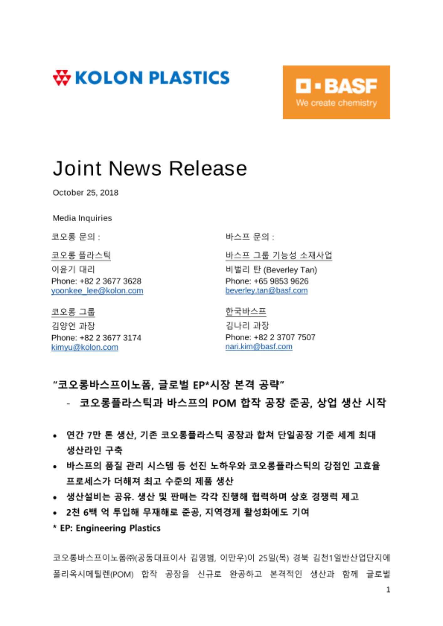 코오롱바스프이노폼의 공동대표이기도 한 코오롱플라스틱의 김영범 대표는 “이번 합작 공장은 양사가 가진 강점을 극대화해 글로벌 화학시장에서 성공적 협력으로 사업시너지를 창출한 대표적인 사례”라고 평가하며 “POM 외에도 다양한 사업에서 협력관계를 구축해 나갈 것”이라 밝혔다.