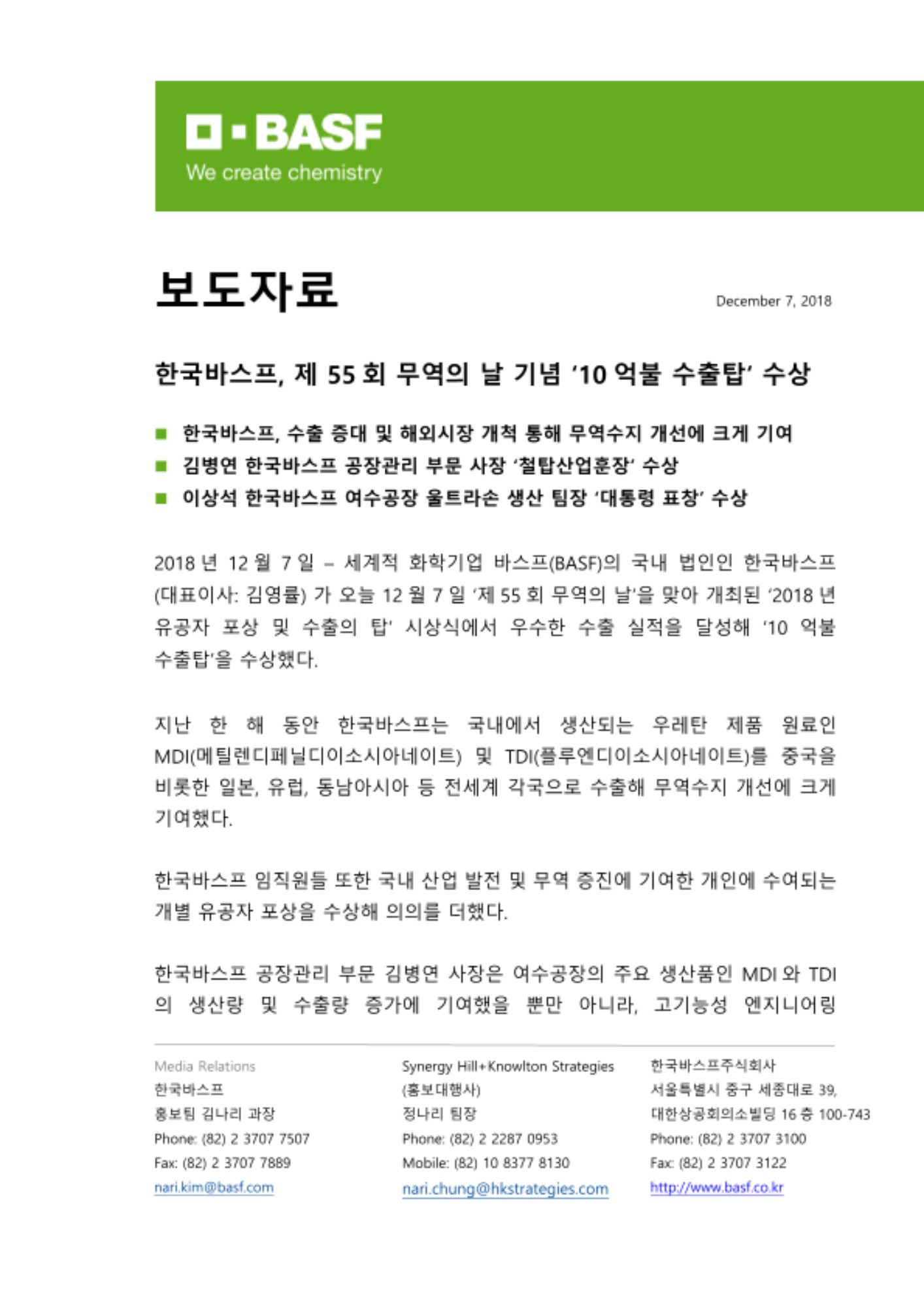 2018년 12월 7일 – 세계적 화학기업 바스프(BASF)의 국내 법인인 한국바스프 (대표이사: 김영률) 가 오늘 12월 7일 ‘제55회 무역의 날’을 맞아 개최된 ‘2018년 유공자 포상 및 수출의 탑’ 시상식에서 우수한 수출 실적을 달성해 ‘10억불 수출탑’을 수상했다.