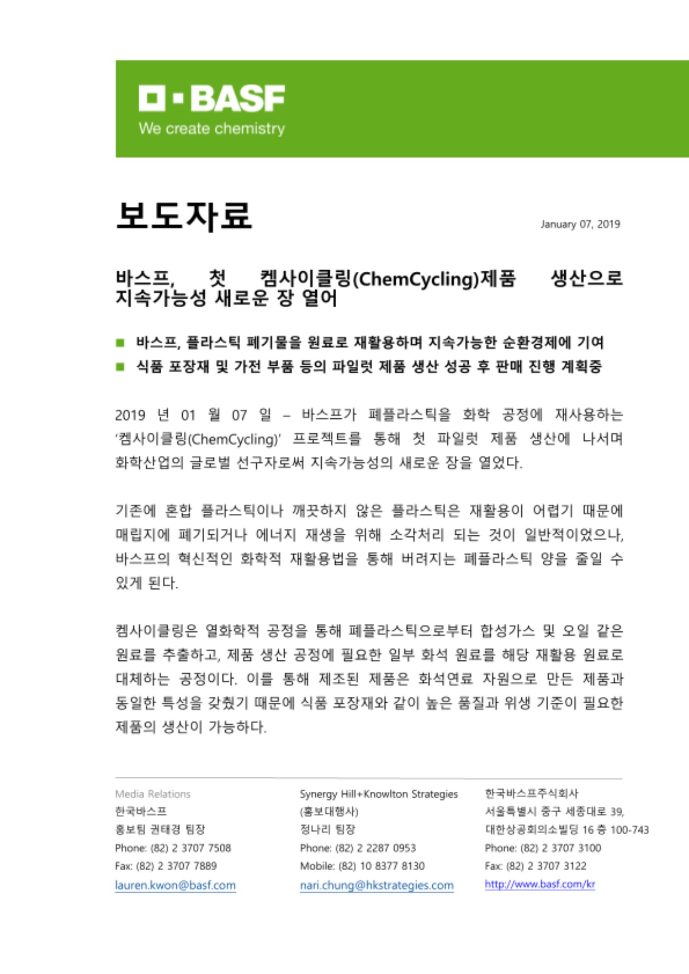 스테판 그래터 (Stefan Gräter) 바스프 켐사이클링 프로젝트 담당은 “바스프의 새로운 재활용법은 재활용 소재로 만든 양질의 제품과 포장재에 높은 중요성과 가치를 부여하는 기업들에게 혁신적인 사업 모델을 제공 할 것.”이라고 덧붙였다.