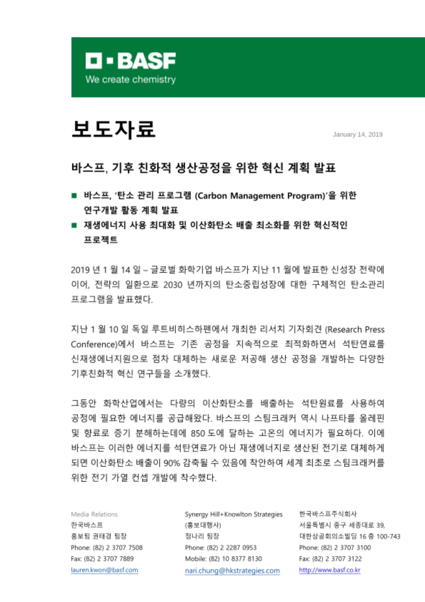 2019년 1월 14일 – 글로벌 화학기업 바스프가 지난 11월에 발표한 신성장 전략에 이어, 전략의 일환으로 2030년까지의 탄소중립성장에 대한 구체적인 탄소관리 프로그램을 발표했다.
