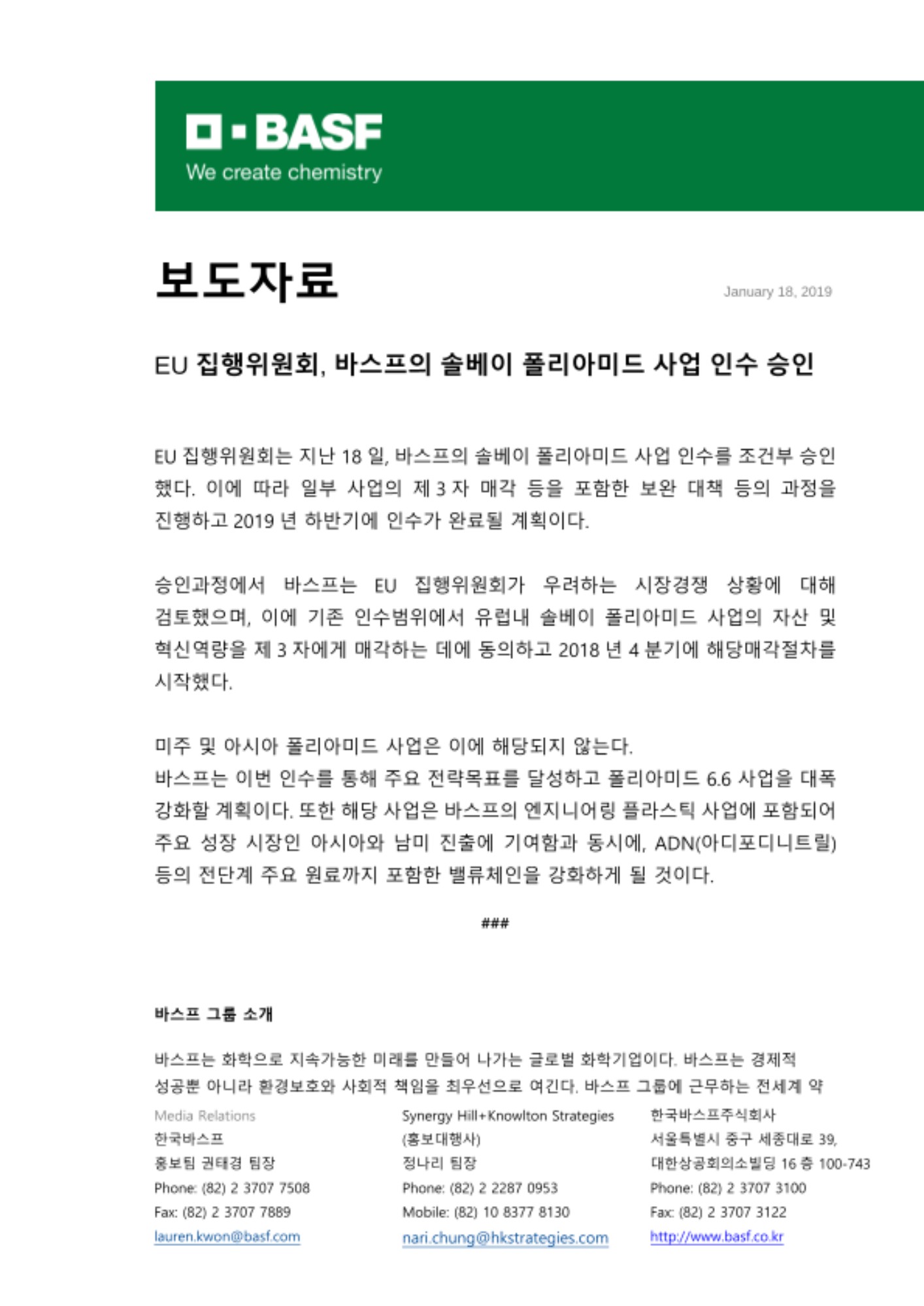 바스프는 이번 인수를 통해 주요 전략목표를 달성하고 폴리아미드 6.6 사업을 대폭 강화할 계획이다. 또한 해당 사업은 바스프의 엔지니어링 플라스틱 사업에 포함되어 주요 성장 시장인 아시아와 남미 진출에 기여함과 동시에, ADN(아디포디니트릴) 등의 전단계 주요 원료까지 포함한 밸류체인을 강화하게 될 것이다.