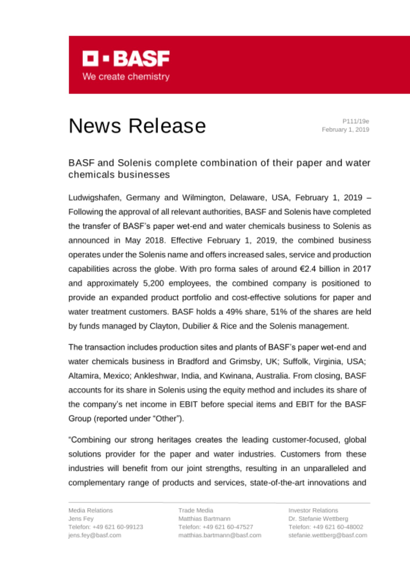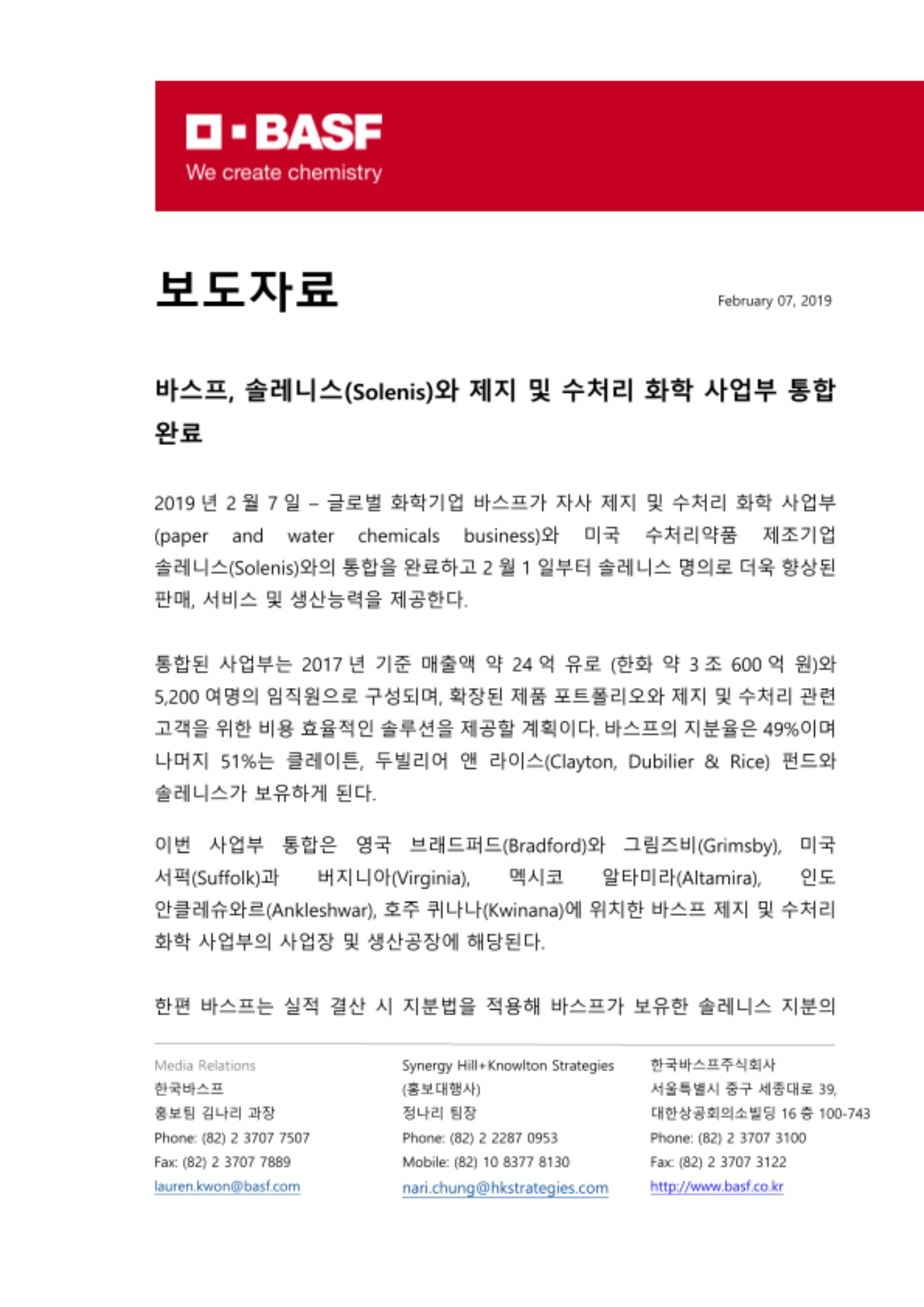 2019년 2월 7일 – 글로벌 화학기업 바스프가 자사 제지 및 수처리 화학 사업부 (paper and water chemicals business)와 미국 수처리약품 제조기업 솔레니스(Solenis)와의 통합을 완료하고 2월 1일부터 솔레니스 명의로 더욱 향상된 판매, 서비스 및 생산능력을 제공한다.