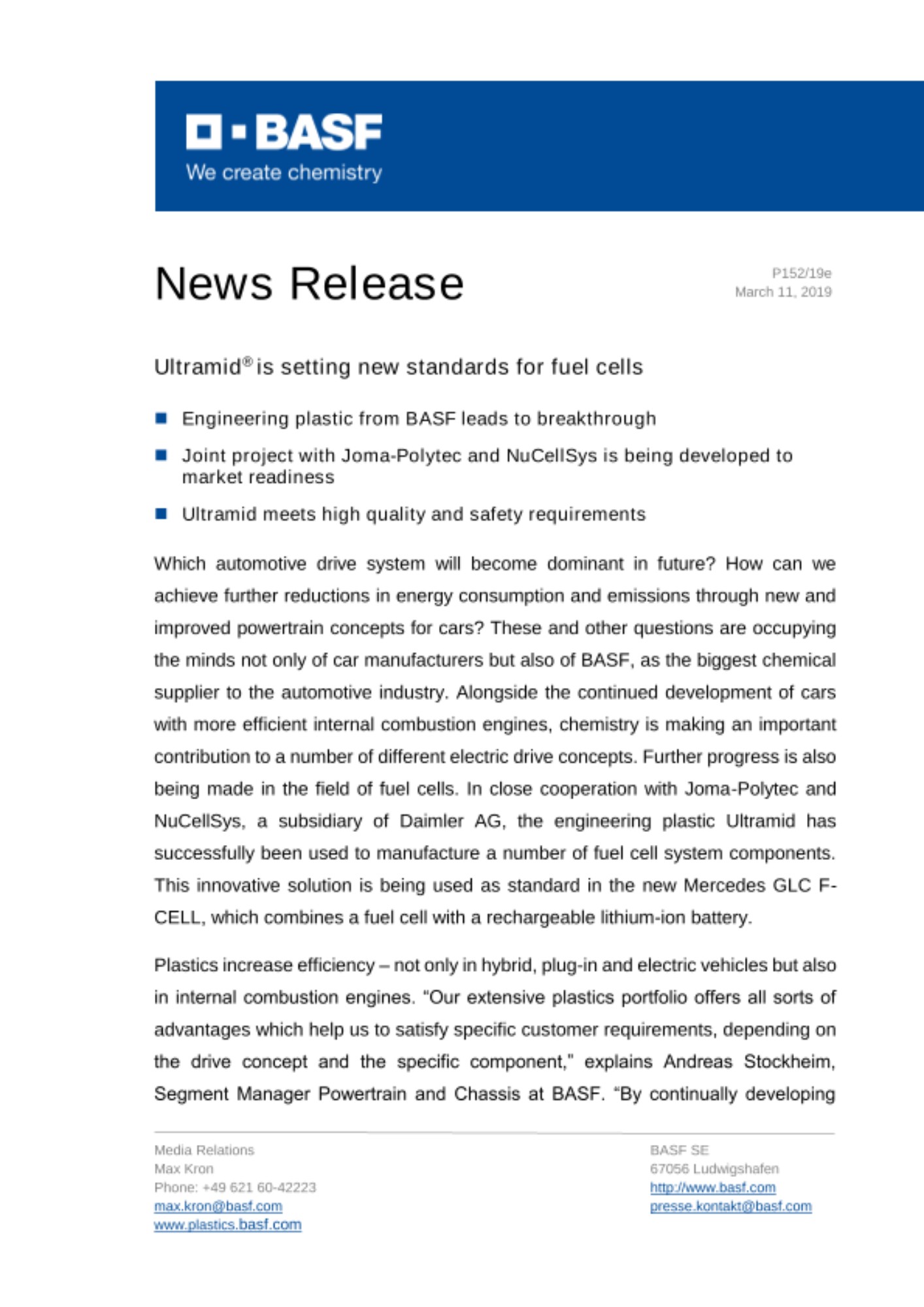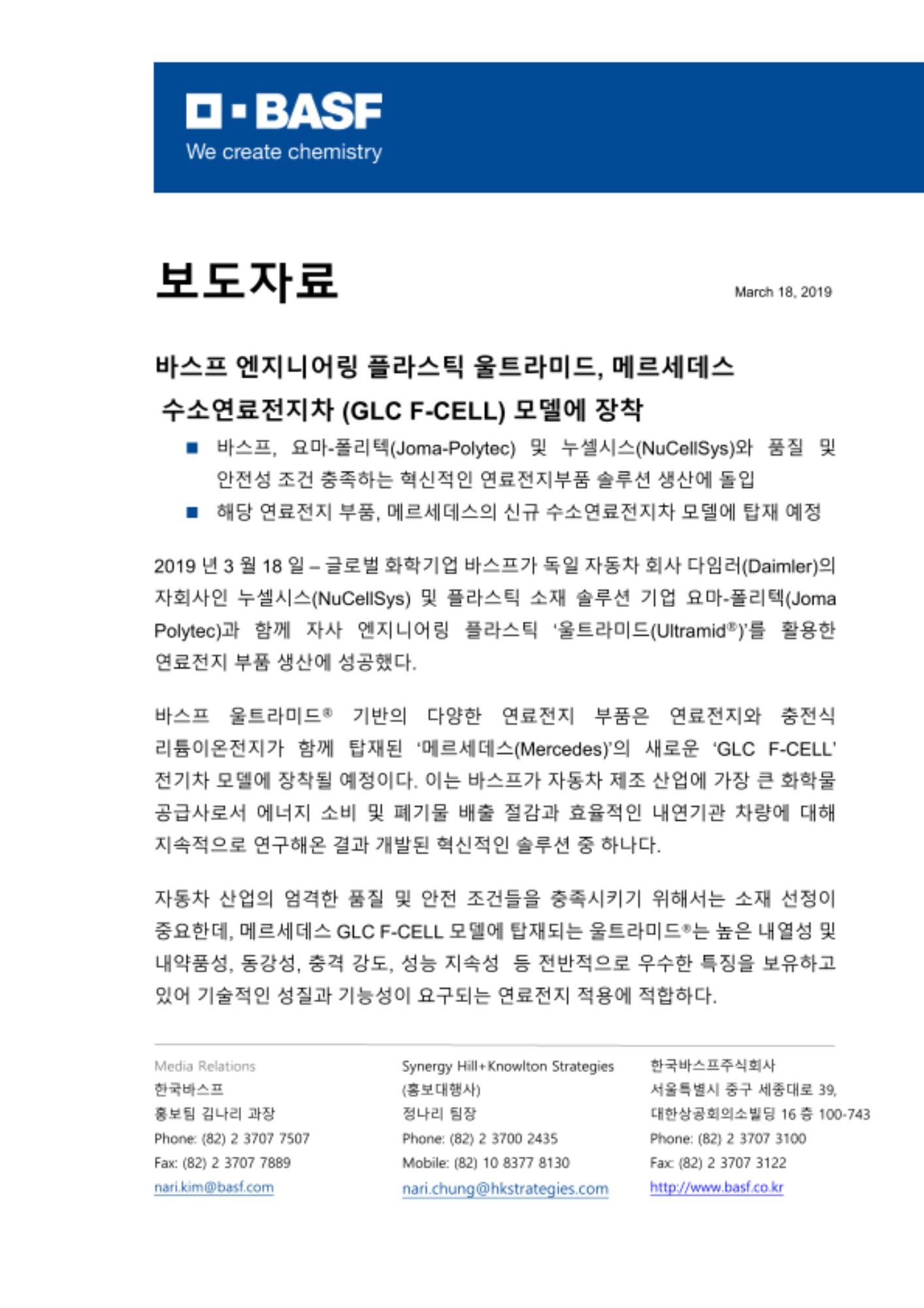 2019년 3월 18일 – 글로벌 화학기업 바스프가 독일 자동차 회사 다임러(Daimler)의 자회사인 누셀시스(NuCellSys) 및 플라스틱 소재 솔루션 기업 요마-폴리텍(Joma Polytec)과 함께 자사 엔지니어링 플라스틱 ‘울트라미드(Ultramid®)’를 활용한 연료전지 부품 생산에 성공했다.