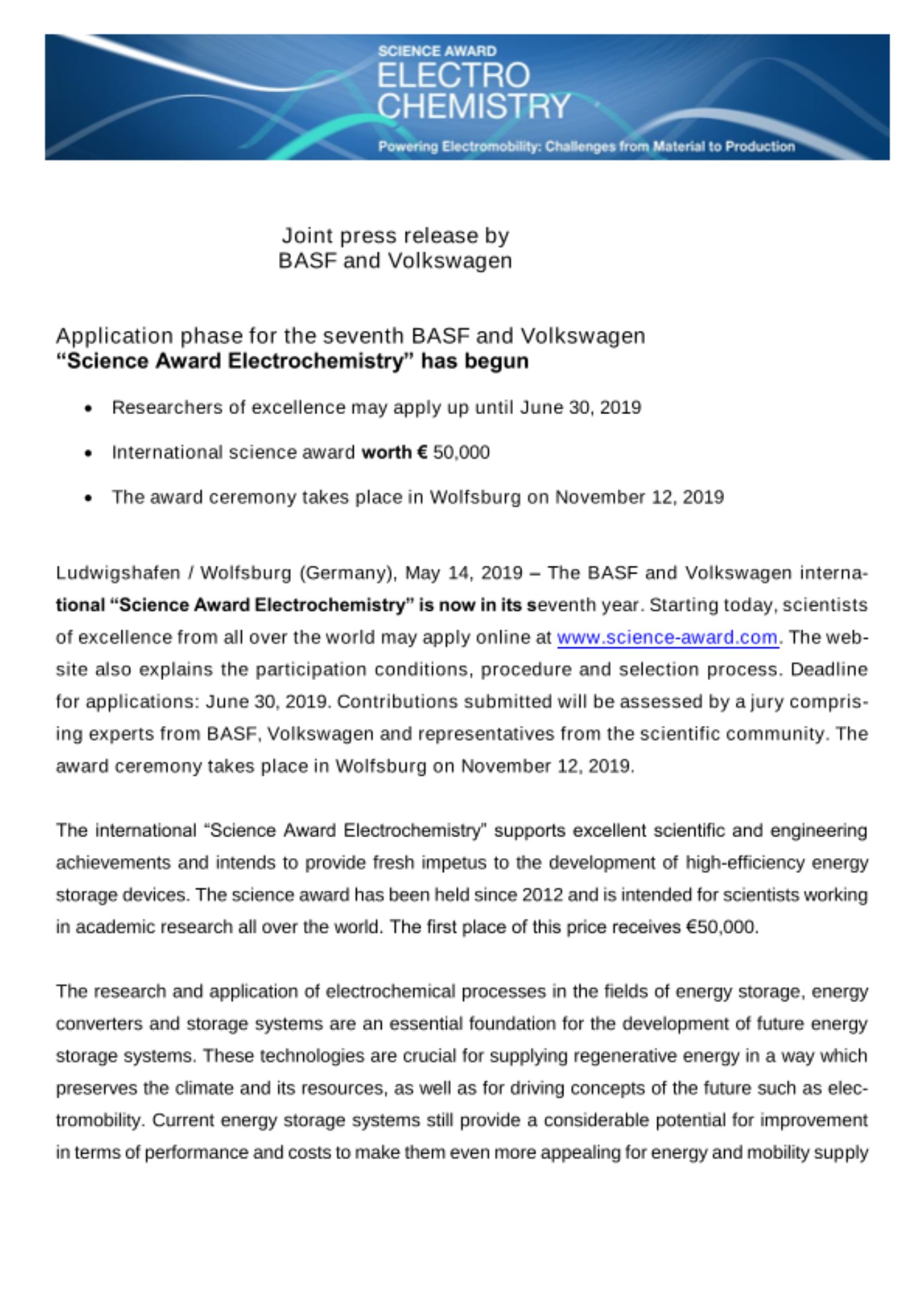 지원을 원하는 전세계 참가자들은 오는 6월 30일까지 공식 웹사이트 (www.science-award.com)를 통해 관련 논문을 제출하면 된다. 바스프 및 폭스바겐 내 전문가들과 학자들로 구성된 평가단의 심사를 거쳐 논문이 선정되며, 최우수 수상자에게는5만 유로 (한화 약 6500만 원)의 상금이 주어진다. 시상식은 오는 11월 12일 독일 볼프스부르크에서 진행 예정이며, 지원자격 및 선발과정에 대한 자세한 내용은 공식 웹사이트를 통해 확인 가능하다.