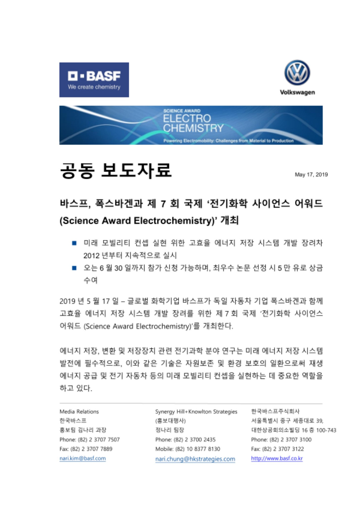 2019년 5월 17일 – 글로벌 화학기업 바스프가 독일 자동차 기업 폭스바겐과 함께 고효율 에너지 저장 시스템 개발 장려를 위한 제7회 국제 ‘전기화학 사이언스 어워드 (Science Award Electrochemistry)’를 개최한다.