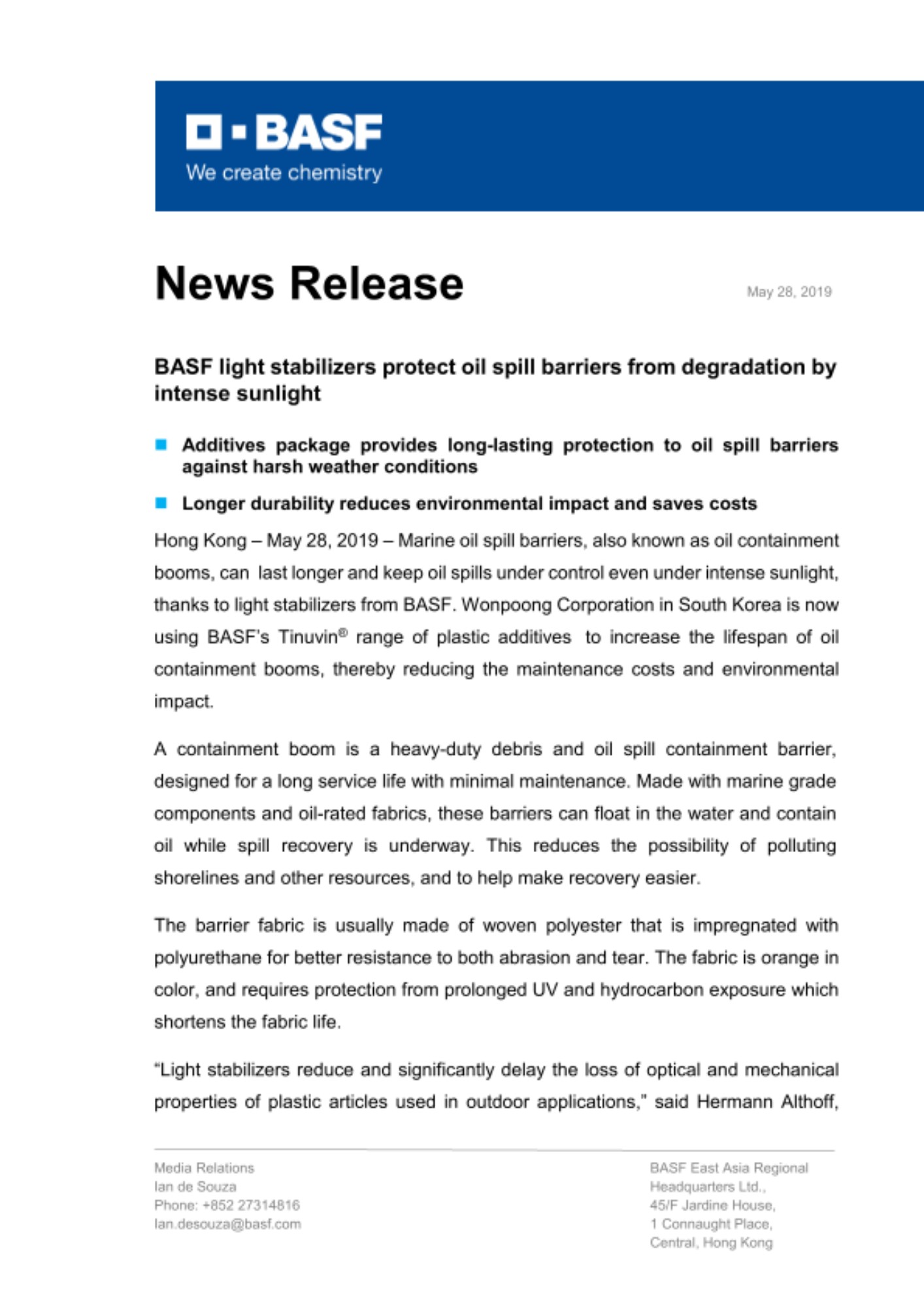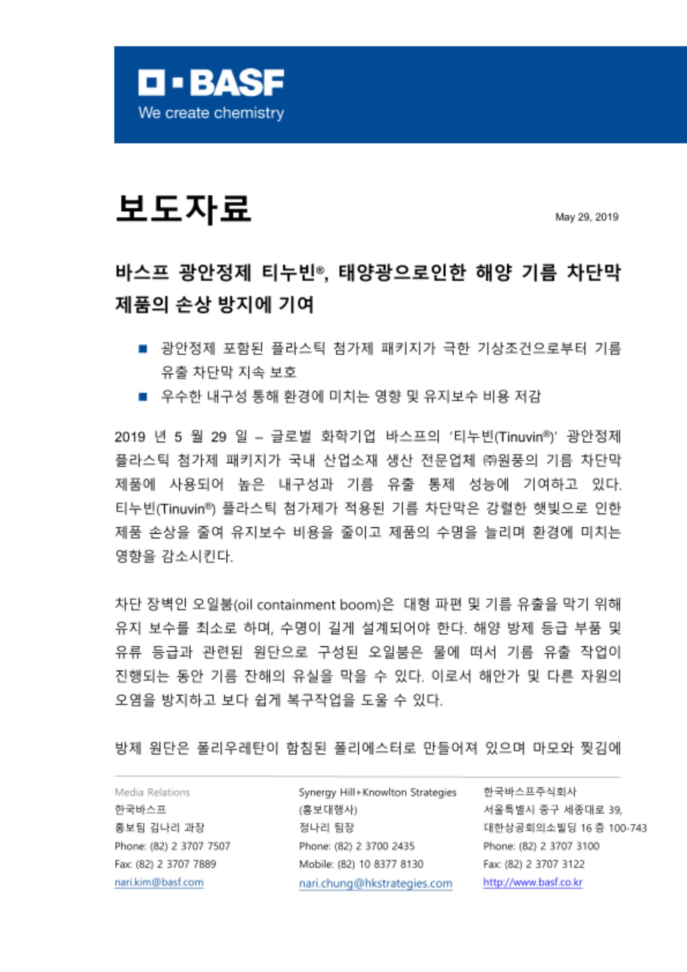 2019년 5월 29일 – 글로벌 화학기업 바스프의 ‘티누빈(Tinuvin®)’ 광안정제 플라스틱 첨가제 패키지가 국내 산업소재 생산 전문업체 ㈜원풍의 기름 차단막 제품에 사용되어 높은 내구성과 기름 유출 통제 성능에 기여하고 있다. 티누빈(Tinuvin®) 플라스틱 첨가제가 적용된 기름 차단막은 강렬한 햇빛으로 인한 제품 손상을 줄여 유지보수 비용을 줄이고 제품의 수명을 늘리며 환경에 미치는 영향을 감소시킨다.