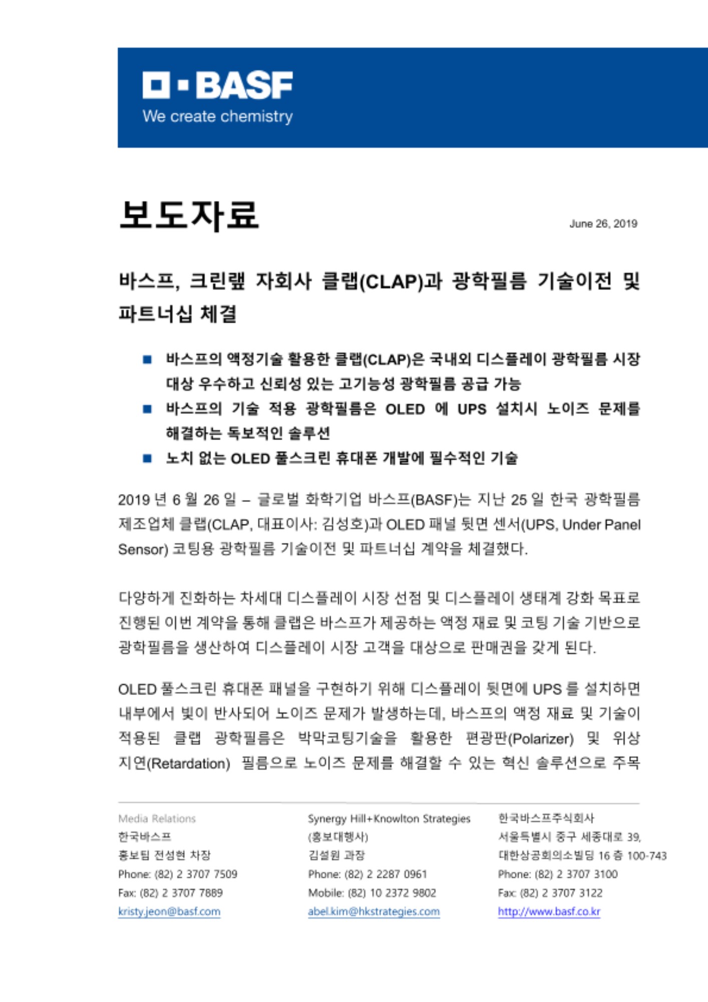 2019년 6월 26일 – 글로벌 화학기업 바스프(BASF)는 지난 25일 한국 광학필름 제조업체 클랩(CLAP, 대표이사: 김성호)과 OLED 패널 뒷면 센서(UPS, Under Panel Sensor) 코팅용 광학필름 기술이전 및 파트너십 계약을 체결했다.
