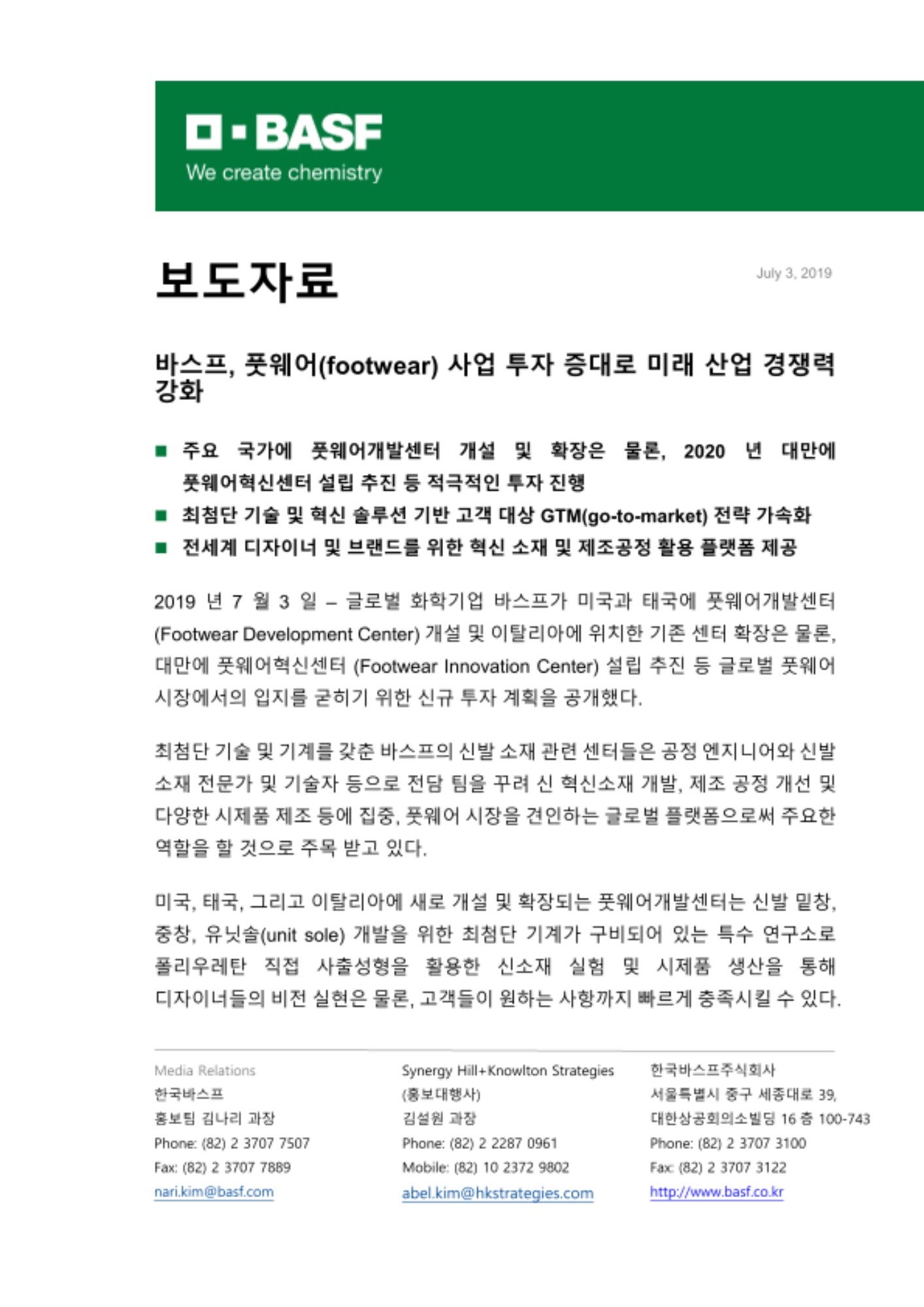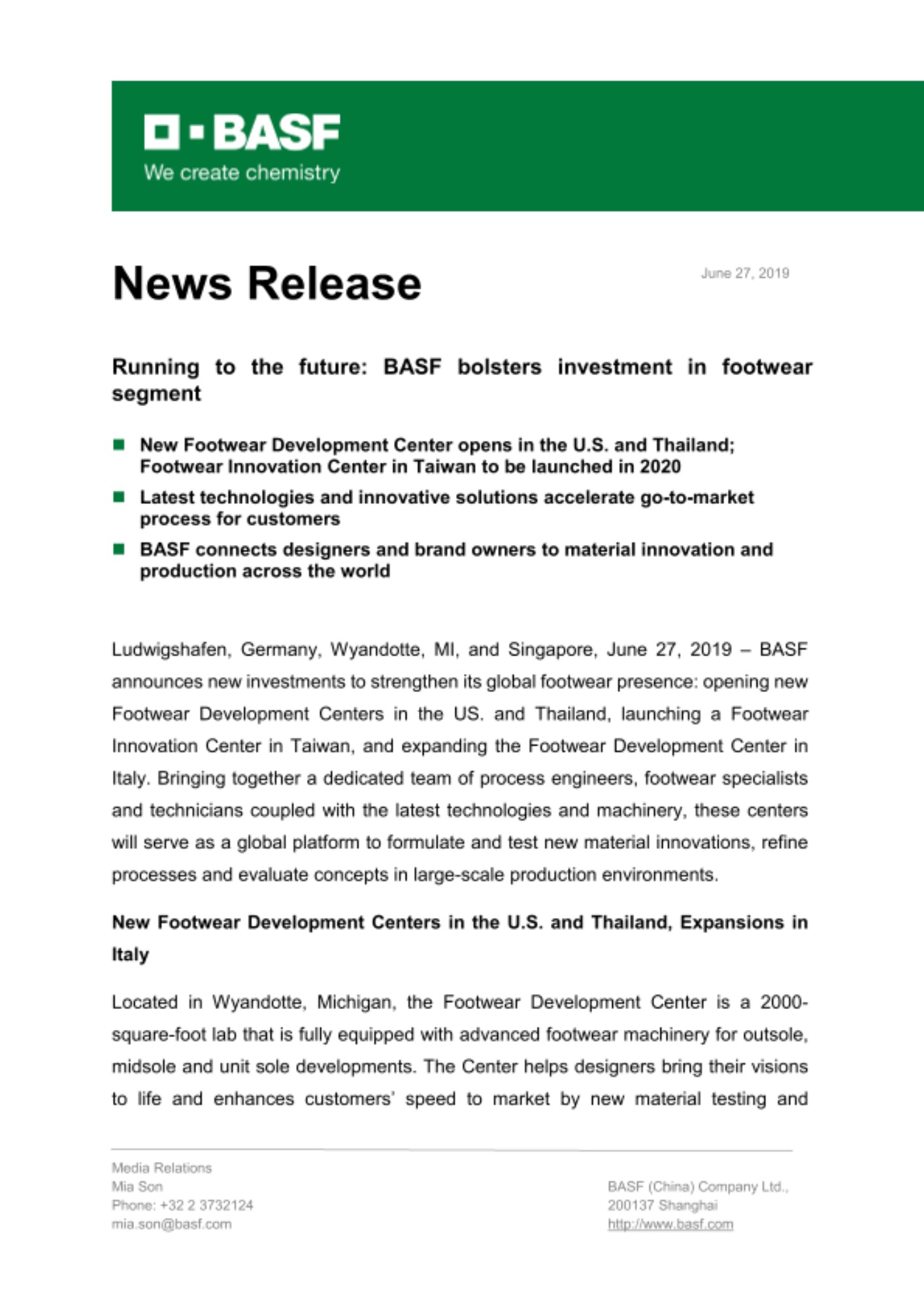 2019년 7월 3일 – 글로벌 화학기업 바스프가 미국과 태국에 풋웨어개발센터 (Footwear Development Center) 개설 및 이탈리아에 위치한 기존 센터 확장은 물론, 대만에 풋웨어혁신센터 (Footwear Innovation Center) 설립 추진 등 글로벌 풋웨어 시장에서의 입지를 굳히기 위한 신규 투자 계획을 공개했다.