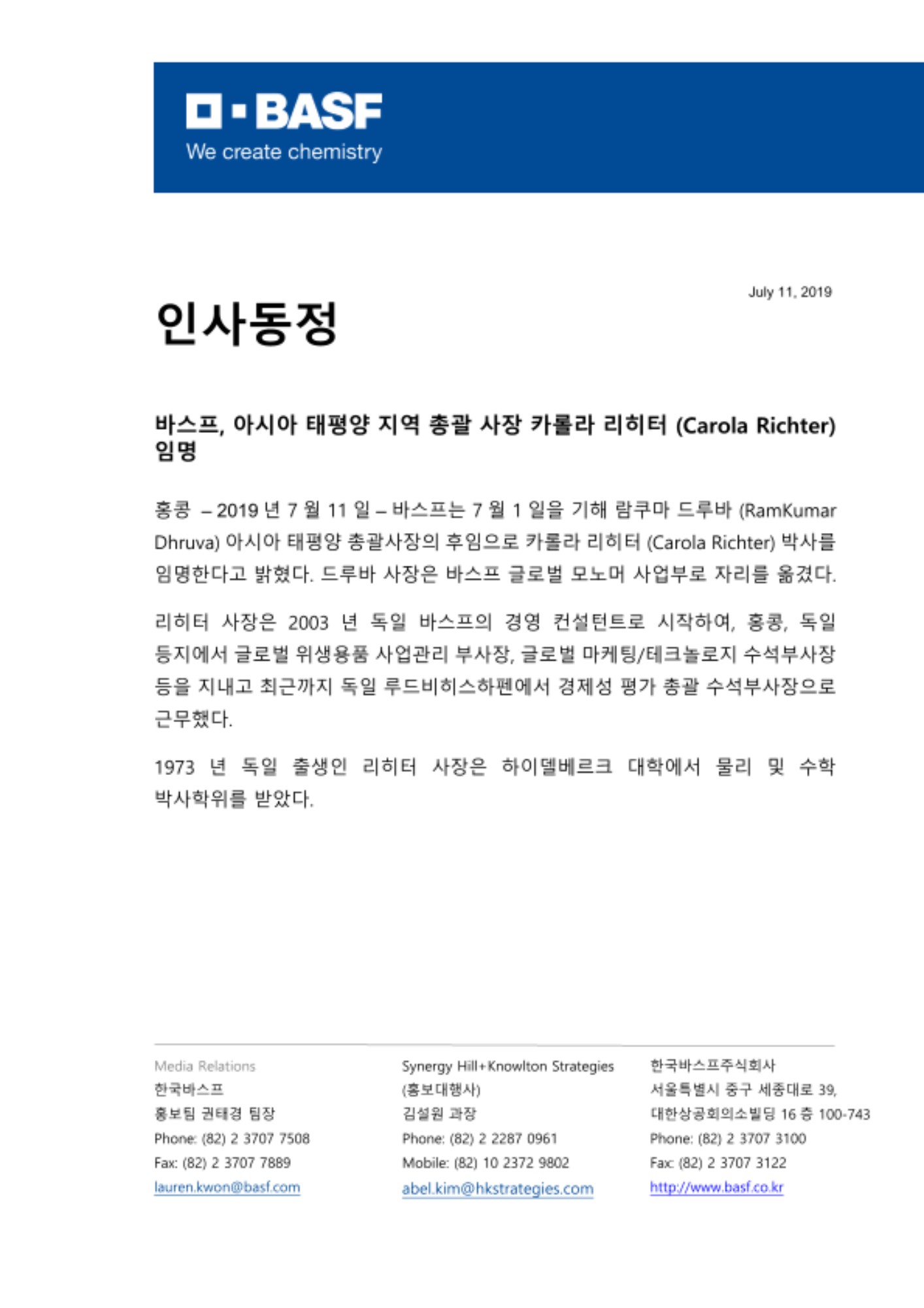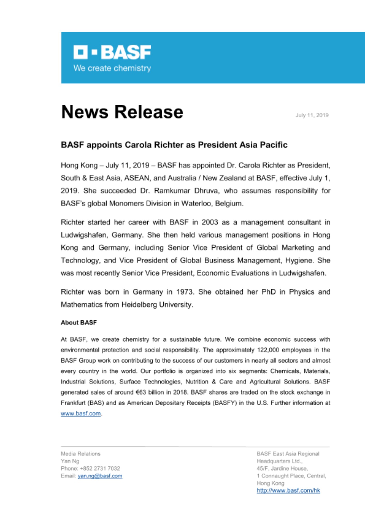 홍콩 – 2019년 7월 11일 – 바스프는 7월 1일을 기해 람쿠마 드루바 (RamKumar Dhruva) 아시아 태평양 총괄사장의 후임으로 카롤라 리히터 (Carola Richter) 박사를 임명한다고 밝혔다. 드루바 사장은 바스프 글로벌 모노머 사업부로 자리를 옮겼다.