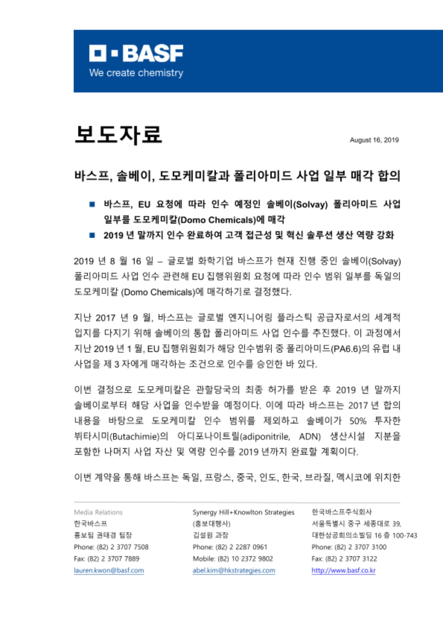 2019년 8월 16일 – 글로벌 화학기업 바스프가 현재 진행 중인 솔베이(Solvay) 폴리아미드 사업 인수 관련해 EU집행위원회 요청에 따라 인수 범위 일부를 독일의 도모케미칼 (Domo Chemicals)에 매각하기로 결정했다.