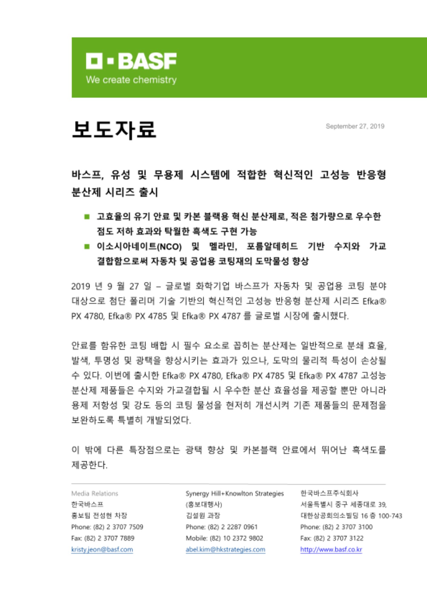 2019년 9월 27일 – 글로벌 화학기업 바스프가 자동차 및 공업용 코팅 분야 대상으로 첨단 폴리머 기술 기반의 혁신적인 고성능 반응형 분산제 시리즈 Efka® PX 4780, Efka® PX 4785 및 Efka® PX 4787를 글로벌 시장에 출시했다.