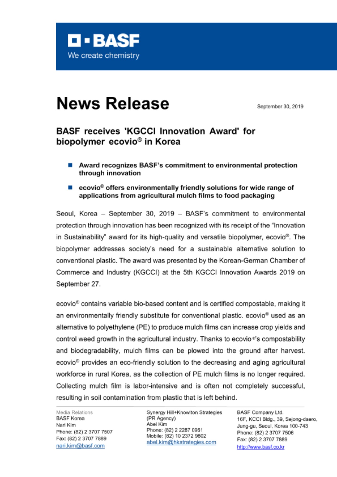 - 바스프의 다용도 생분해성 플라스틱 이코비오, 한독상공회의소 주최 ‘KGCCI 이노베이션 어워드’서 지속가능성 부문 수상