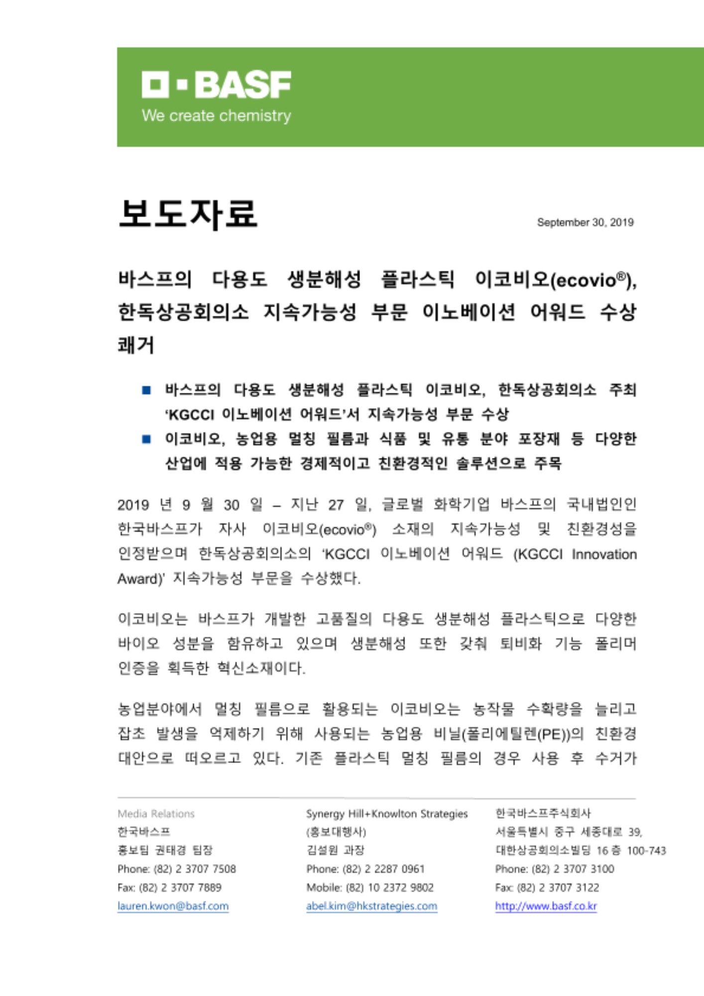 2019년 9월 30일 – 지난 27일, 글로벌 화학기업 바스프의 국내법인인 한국바스프가 자사 이코비오(ecovio®) 소재의 지속가능성 및 친환경성을 인정받으며 한독상공회의소의 ‘KGCCI 이노베이션 어워드 (KGCCI Innovation Award)’ 지속가능성 부문을 수상했다.
