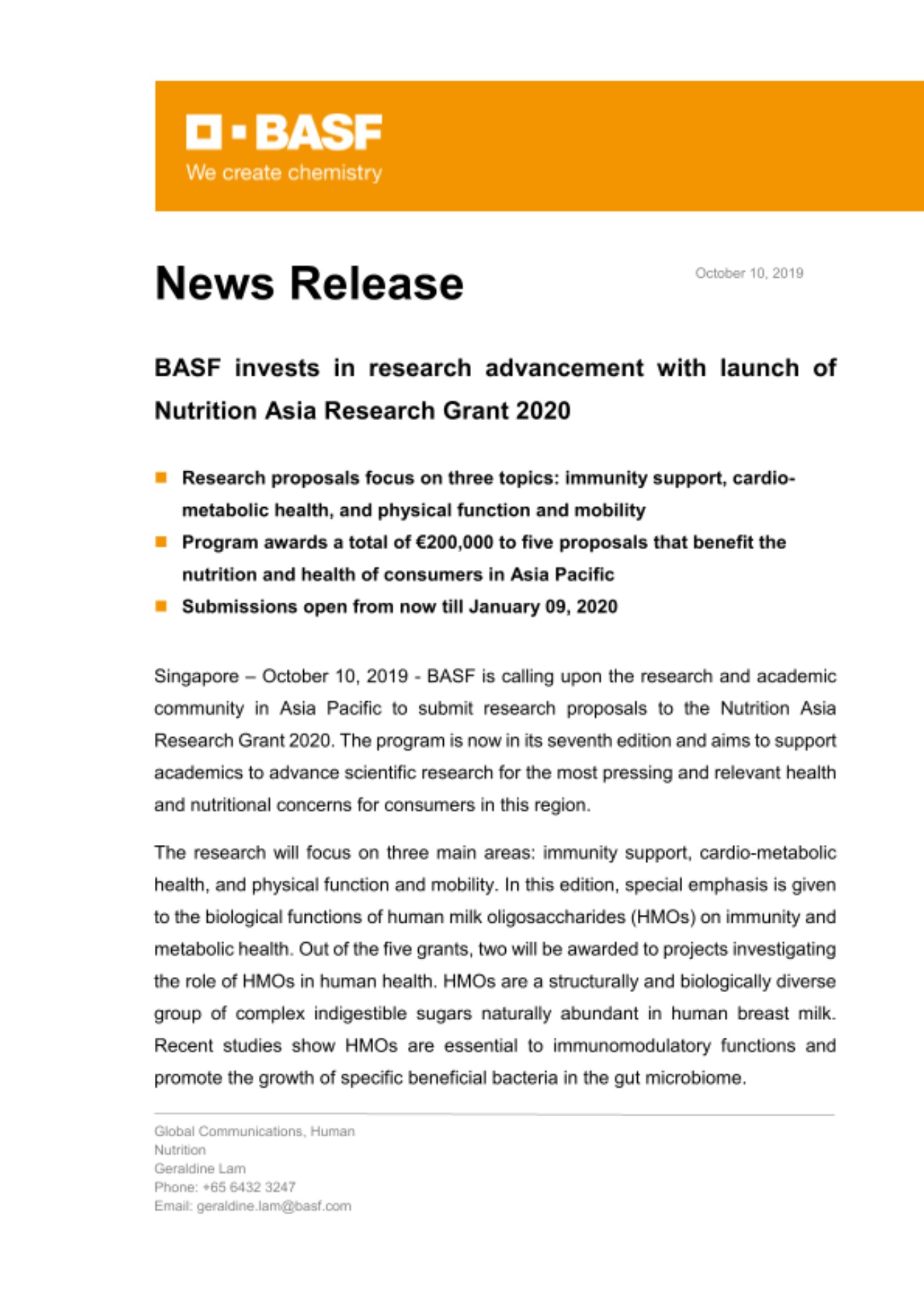 싱가포르 – 2019년 10월 14일 – 글로벌 화학기업 바스프가 2020년 아시아 뉴트리션 연구 지원 프로그램(Nutrition Asia Research Grant 2020) 신청자를 모집, 아태 지역 소비자들이 가장 필요로 하는 ‘건강과 영양’ 문제 해결을 위한 연구를 적극적으로 지원하기 위해 앞장섰다.