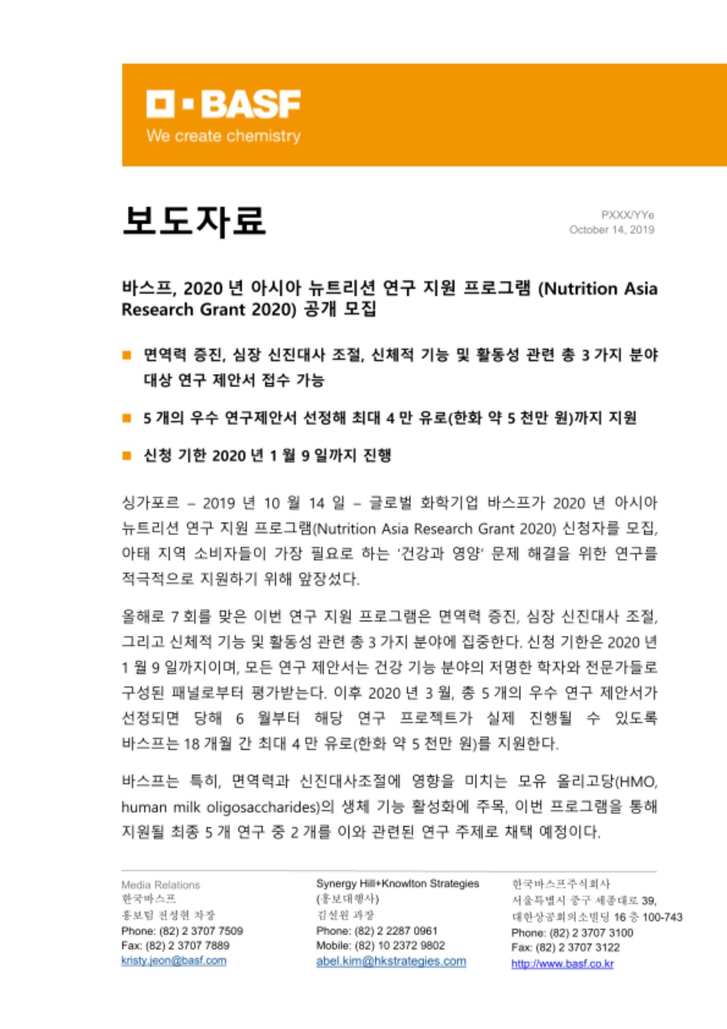 해당 프로그램 및 신청사항에 대한 자세한 정보는 https://nutrition.basf.com/en/Human-nutrition/Cooperations.html, 또는 nutrition-research-grant@basf.com에 이메일 문의로 확인할 수 있다.