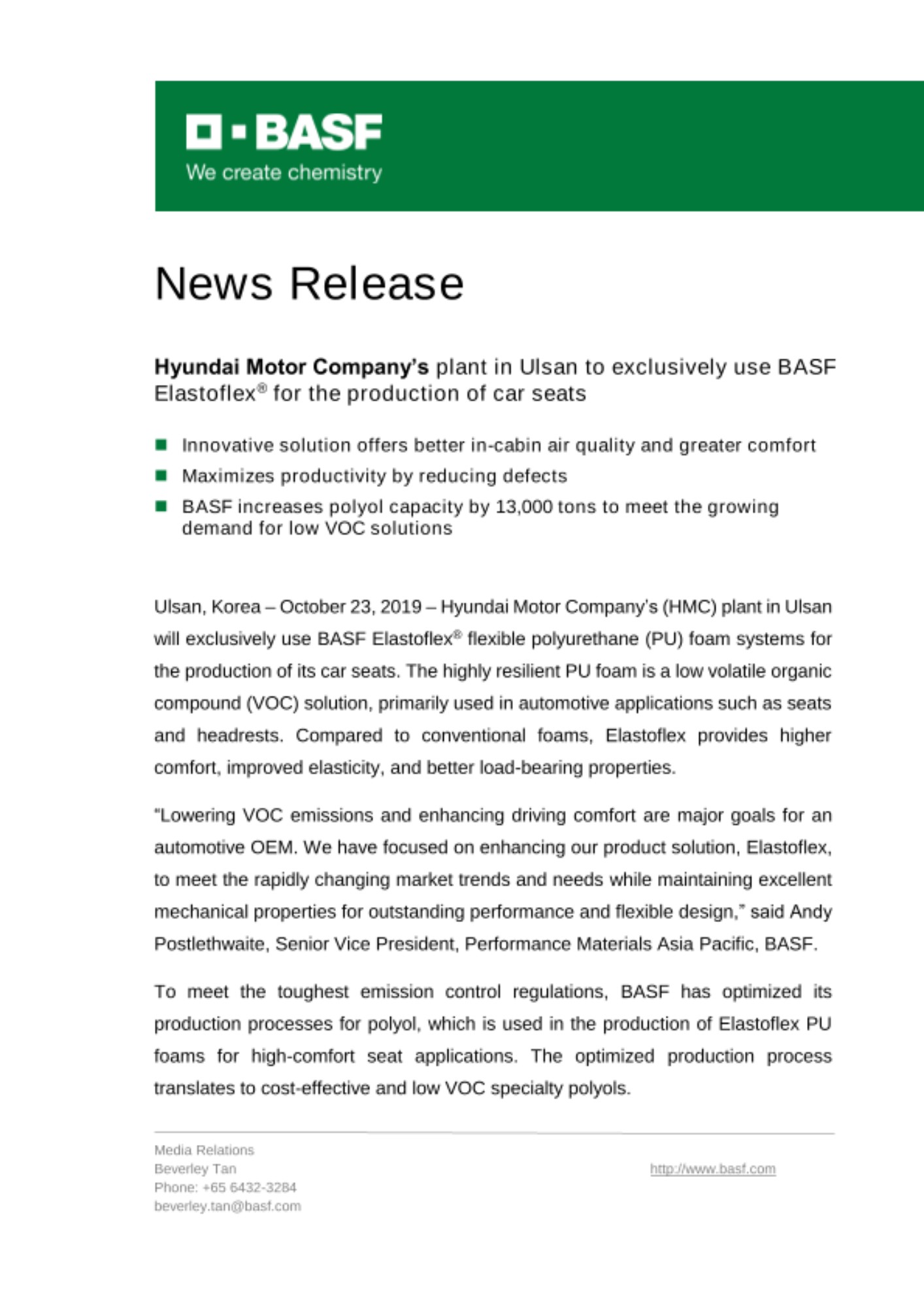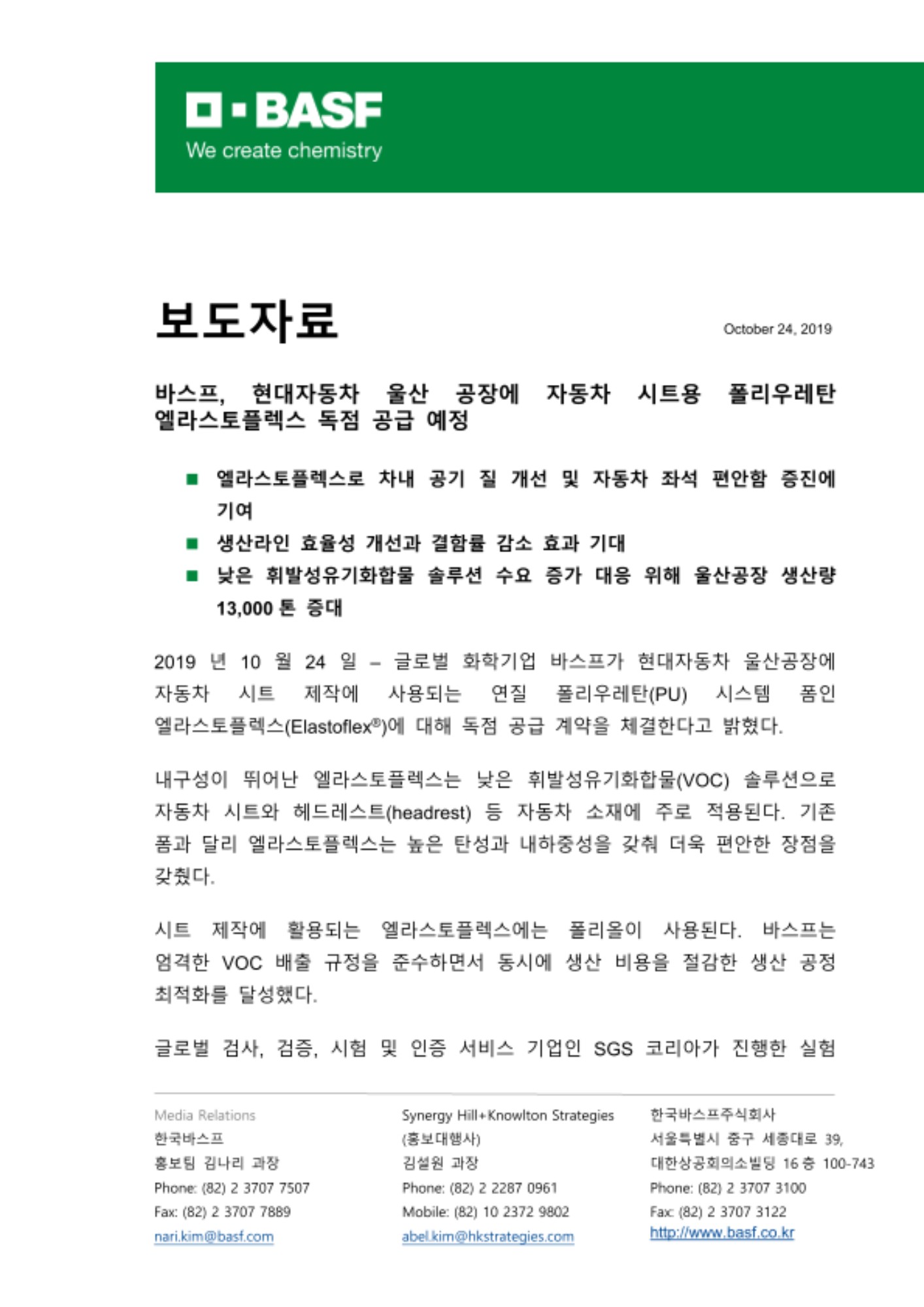 2019년 10월 24일 – 글로벌 화학기업 바스프가 현대자동차 울산공장에 자동차 시트 제작에 사용되는 연질 폴리우레탄(PU) 시스템 폼인 엘라스토플렉스(Elastoflex®)에 대해 독점 공급 계약을 체결한다고 밝혔다.