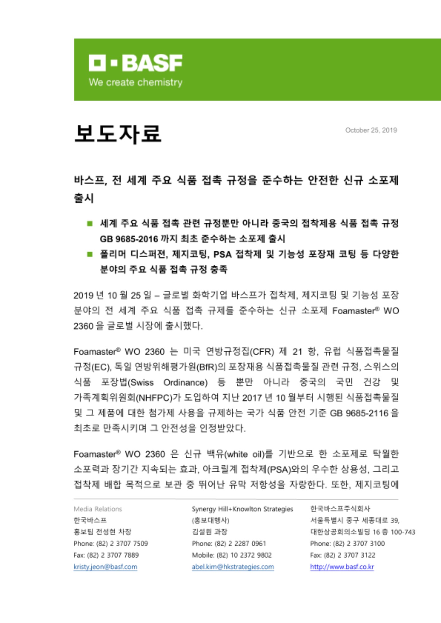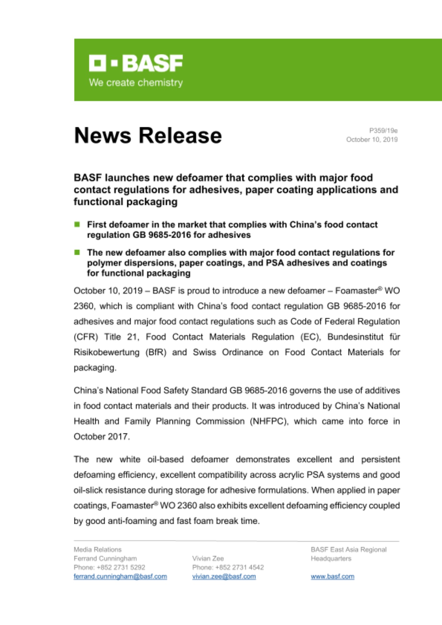 2019년 10월 25일 – 글로벌 화학기업 바스프가 접착제, 제지코팅 및 기능성 포장 분야의 전 세계 주요 식품 접촉 규제를 준수하는 신규 소포제 Foamaster® WO 2360을 글로벌 시장에 출시했다.