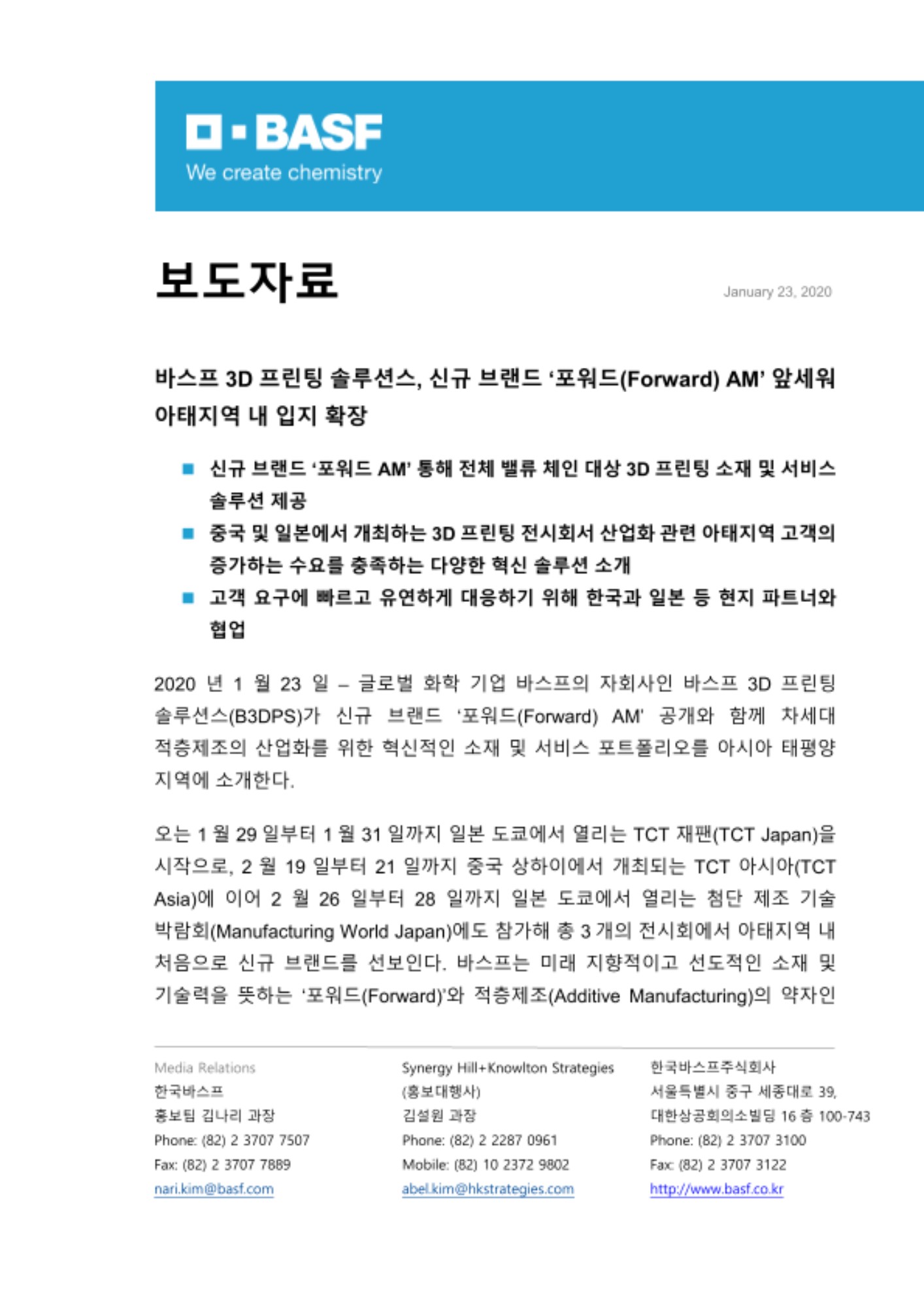 독일 하이델베르그에 본사를 두고 있는 바스프 3D 프린팅 솔루션스(BASF 3D Printing Solutions)는 BASF New Business의 자회사로 포워드(Forward) AM 브랜드 하에 신소재, 시스템 솔루션, 부품 및 서비스 등 3D 프린팅 분야의 사업을 확장하는데 주력하고 있다. 역동적인 3D 프린팅 시장에서 최적의 고객 서비스를 제공하기 위해 스타트업과 유사한 구조를 갖추고 있는 바스프 3D 프린팅 솔루션스는 글로벌 연구 플랫폼과 바스프 내 여러 부서의 기술은 물론 다양한 연구기관, 대학교, 스타트업 및 업계 파트너들과 협력하고 있다. 주요 고객은3D 프린팅을 활용하고자 하는 자동차, 우주항공, 소비재 업계의 제조업체 기업들로 이루어져 있다. 보다 자세한 정보는 www.forward-am.com 에서 확인할 수 있다.